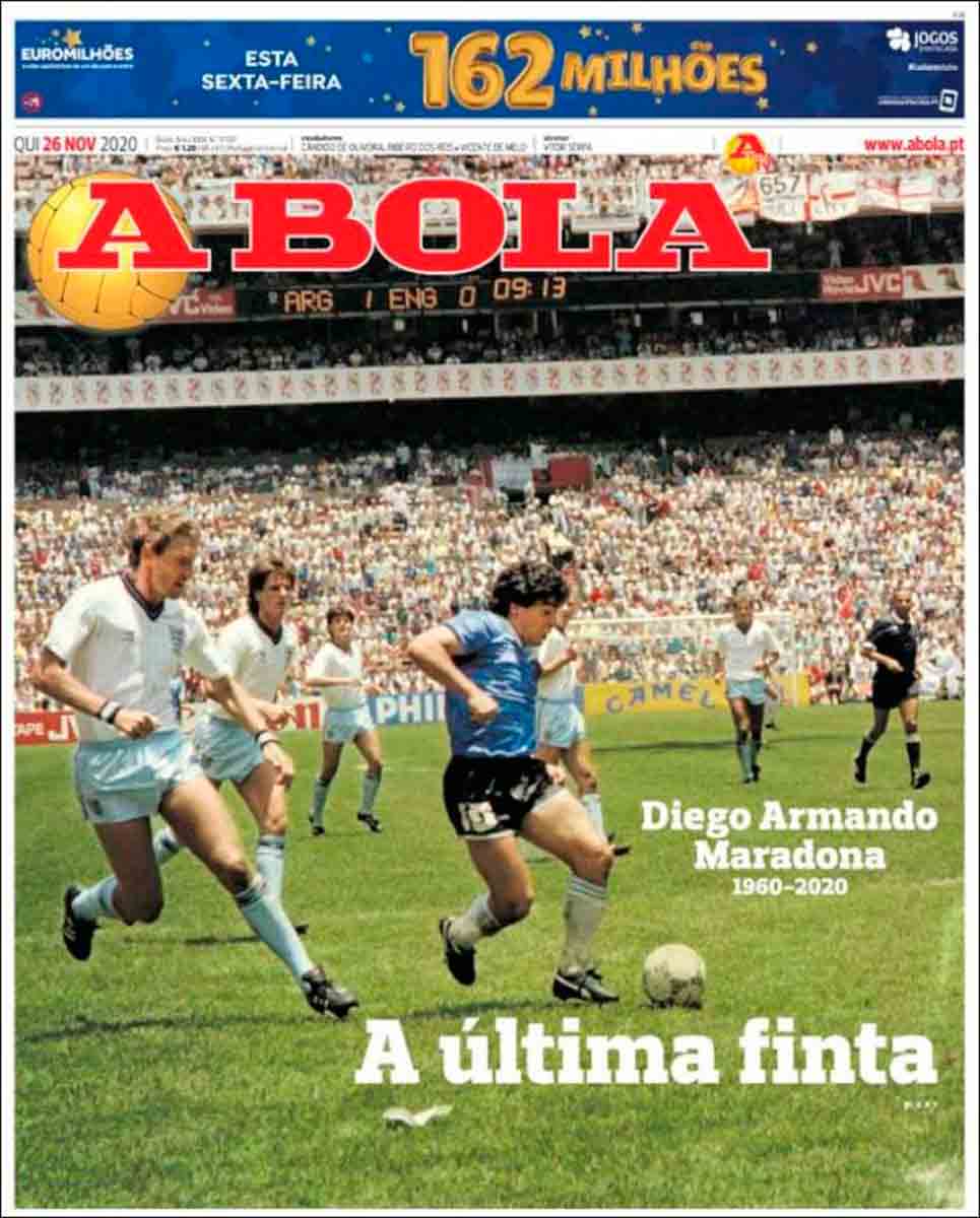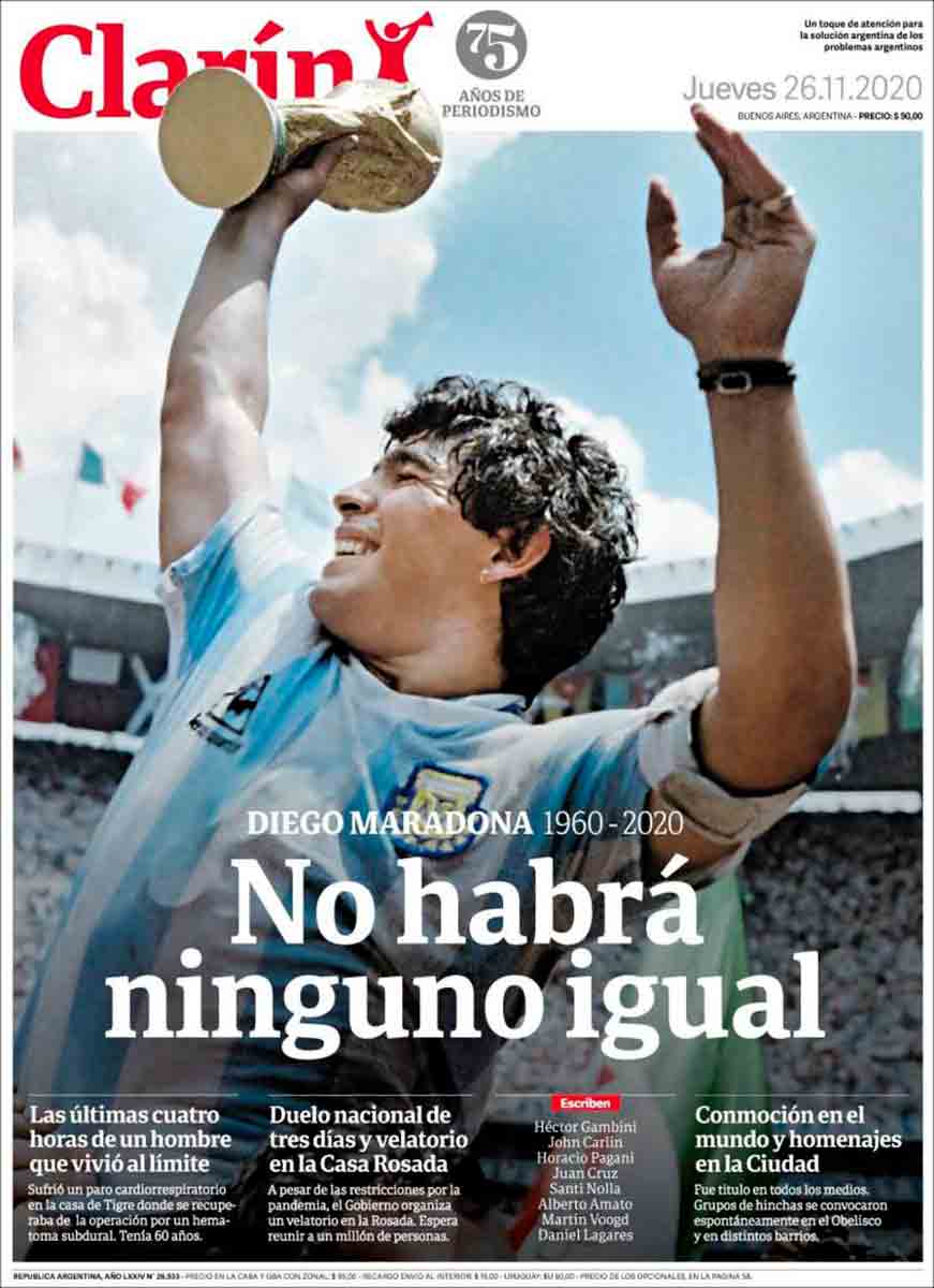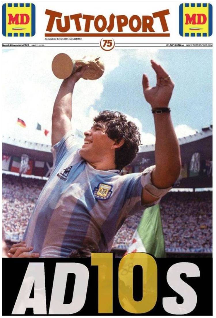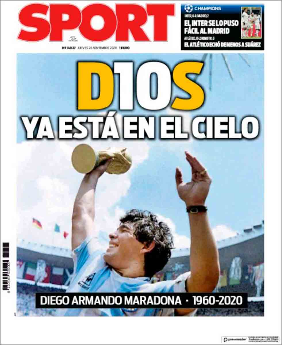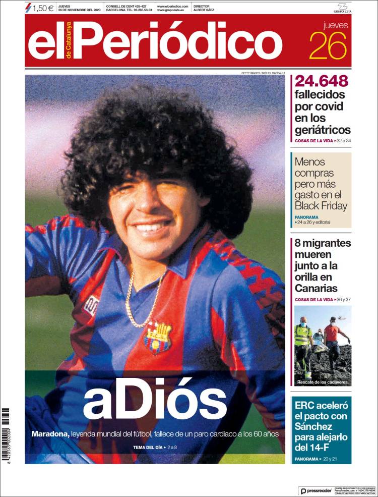 En cuanto a Maradona, viendo las portadas pienso que nos estamos pasando. Grandísimo jugador (quizá el mejor de la historia) que, lejos de ser un dios, era un pobre ser humano sujeto a fuerzas que le sobrepasaron. El futbolista en realidad "muere" el día que se retira de la práctica activa del fútbol. Queda la persona. Y siento más lástima por la persona en que se convirtió que por el hecho de que haya muerto, porque al final todos morimos. Por supuesto, daría mi pésame a su familia y amigos, porque toda pérdida es dolorosa. Incluso a todos esos miles de personas que hoy lloran, especialmente argentinos, porque recuerdan cómo Maradona les hizo felices durante aquel verano del 86.
