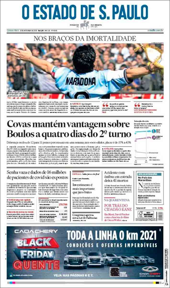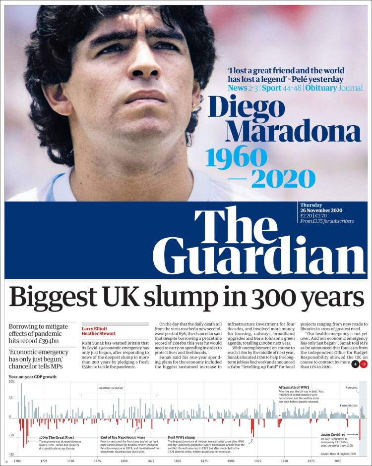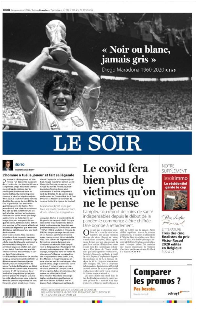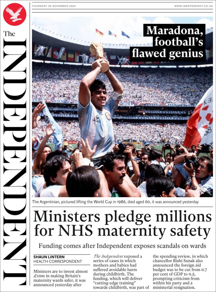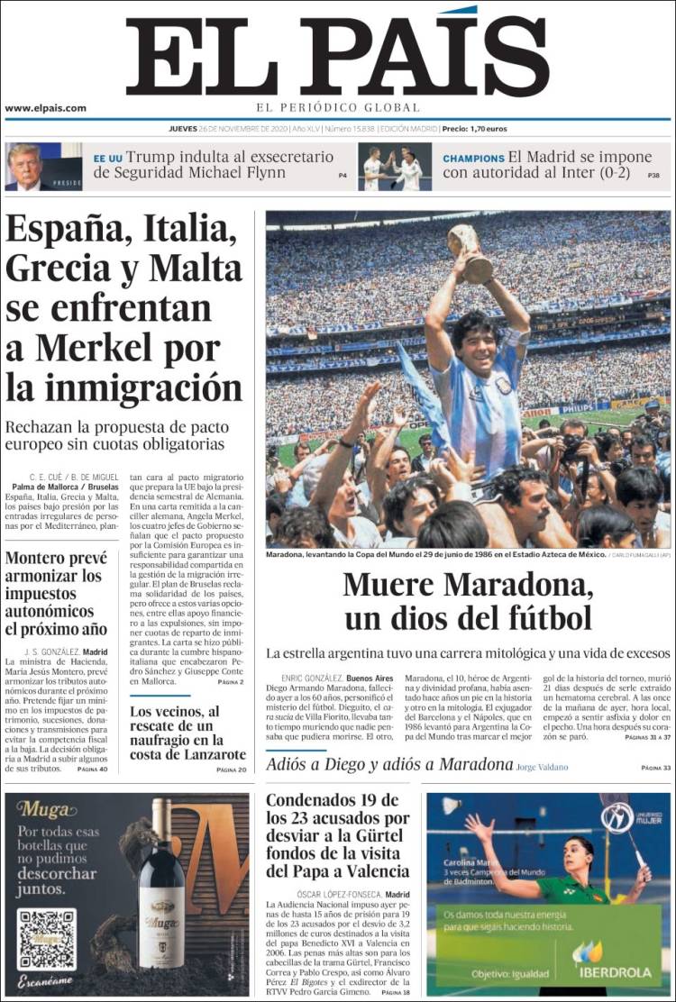 En cuanto a Maradona, viendo las portadas pienso que nos estamos pasando. Grandísimo jugador (quizá el mejor de la historia) que, lejos de ser un dios, era un pobre ser humano sujeto a fuerzas que le sobrepasaron. El futbolista en realidad "muere" el día que se retira de la práctica activa del fútbol. Queda la persona. Y siento más lástima por la persona en que se convirtió que por el hecho de que haya muerto, porque al final todos morimos. Por supuesto, daría mi pésame a su familia y amigos, porque toda pérdida es dolorosa. Incluso a todos esos miles de personas que hoy lloran, especialmente argentinos, porque recuerdan cómo Maradona les hizo felices durante aquel verano del 86.