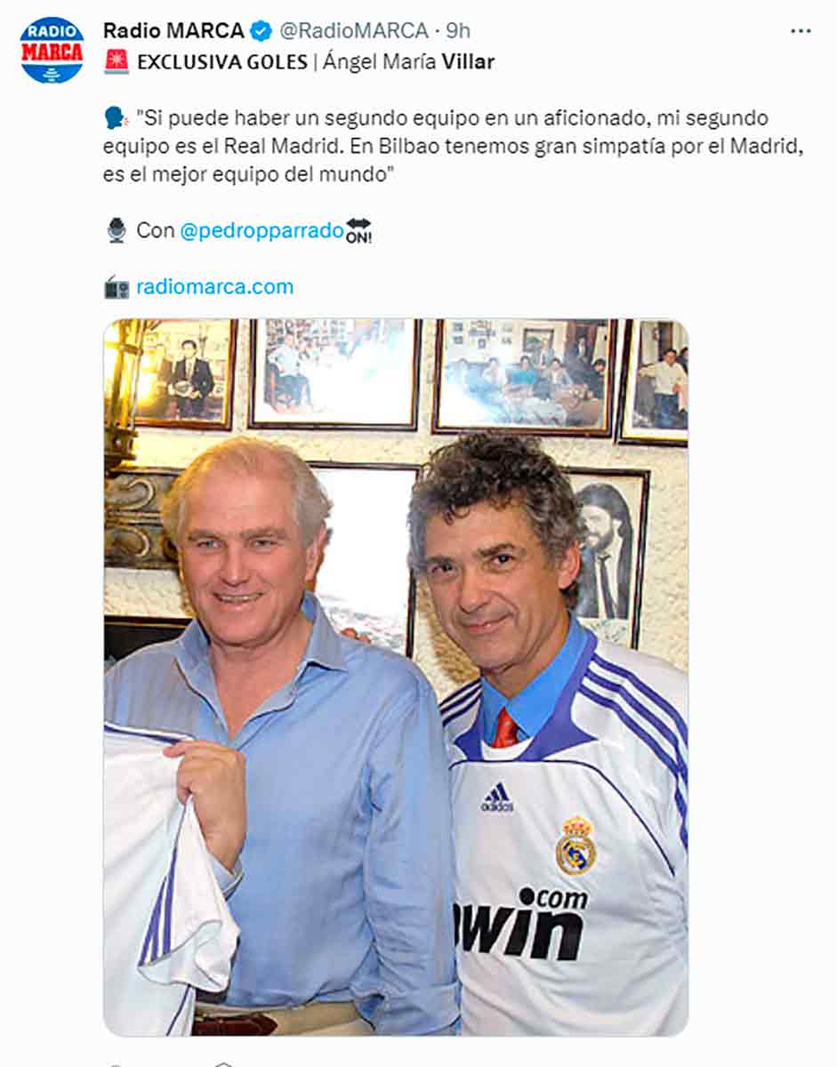 Y además, Villar, que será lo que sea (aunque la Justicia haya decidido no averiguar lo que es), pero no es tonto, sabe cómo funciona la mayoría acéfala y decide meter en la ecuación, que él después del Athletic es del Madrid. Y Marca, cooperador necesario, lo recalca publicando un tuit en el que aparece Villar con la camiseta del Madrid. Junto a Calderón, para más inri.