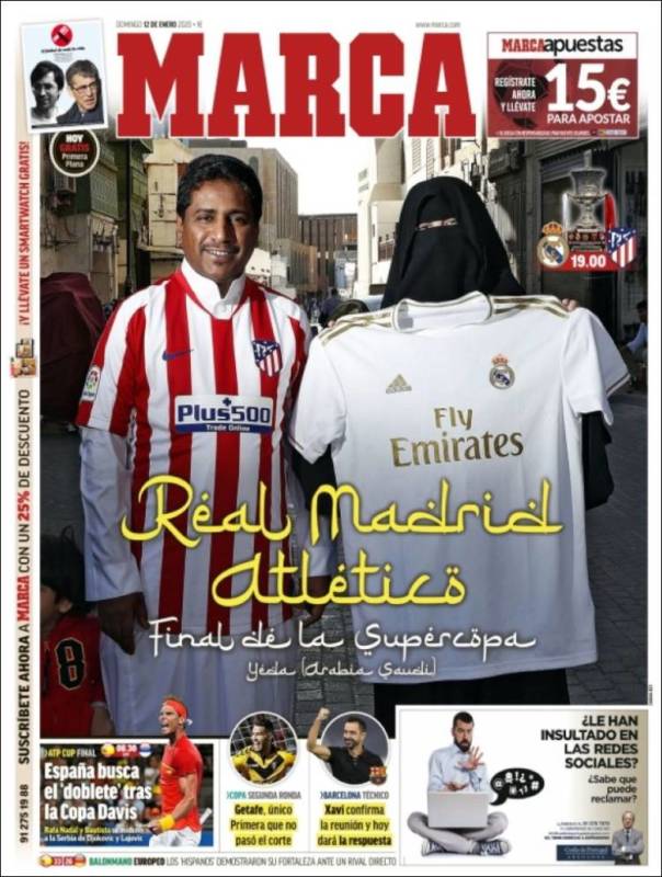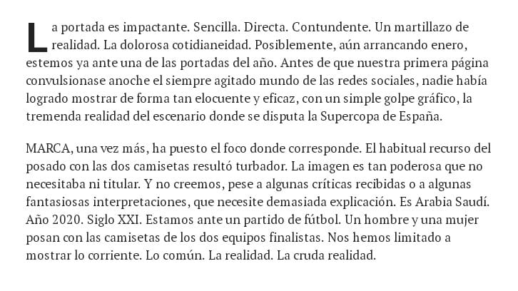 Buenos días. Marca ha liado una buena. No se habla de otra cosa, ya desde anoche en las redes, que de la primera plana que a estas alturas quizá ya hayáis visto, pero que no tenemos inconveniente en volver a mostraros para que podáis escandalizaros o dejaros las manos aplaudiendo, que de todo hay si uno mira las reacciones en Twitter. Justo es decir, con todo, que predomina el escándalo, la gente arremete contra lo que consideran un intento de normalización de la represión que sufre la mujer en Arabia Saudí, país donde esta noche disputan Real Madrid y Atlético la Final de la Supercopa de España.