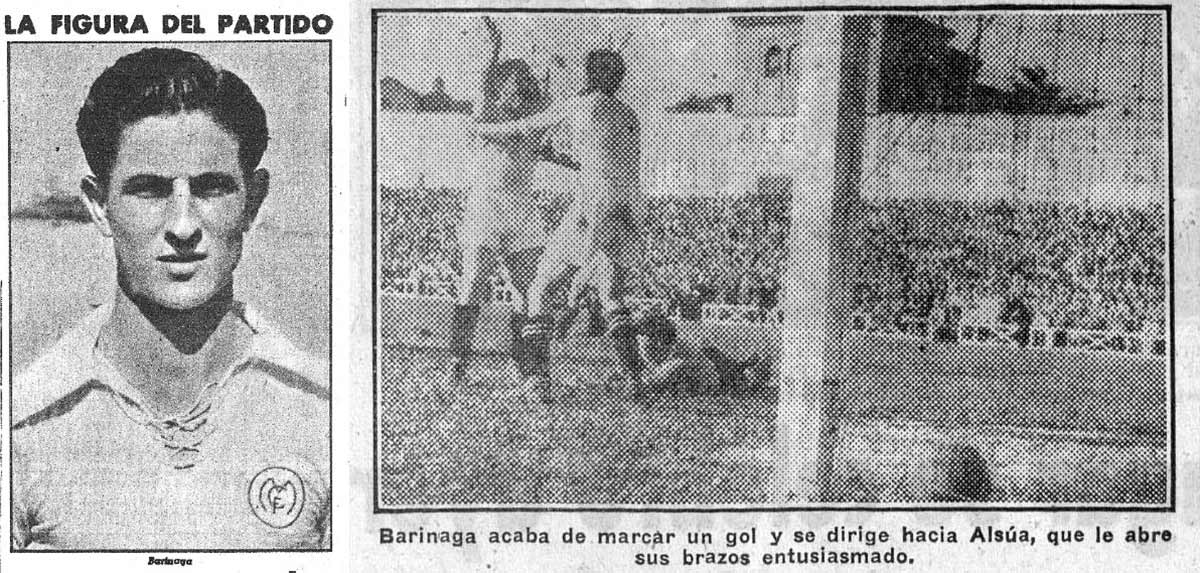 En aquel partido su triplete que terminó en poker lo hizo en apenas doce minutos. El primero de ellos llegó en el minuto treinta y, según relataba la crónica de ‘Pueblo’, se produjo cuando “Barinaga empalma un centro de Alsúa y marca el segundo gol”. El segundo tanto fue tres minutos más tarde al decretar una falta el árbitro Celestino Rodríguez y expulsar a Benito. El tiro libre lo ejecutó “Pruden sobre la puerta, rechazando Miró flojo, lo que permite a Barinaga, bien colocado, llevar la pelota a la red entre el entusiasmo general”. Por último, la diana que certificó el hat-trick fue en el 42’ cuando la defensa catalana rechazó un avance blanco “y Barinaga recoge y después de avanzar tira cruzado y logra el séptimo gol para sus colores”. El vasco redondeó su actuación con el cuarto en su cuenta particular en la última jugada del descanso: “Botella cambia el juego a Alsúa y el centro de este es rematado con precisión por Barinaga al fondo de la red”.