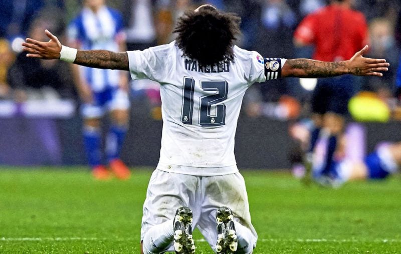 Prácticamente 10 temporadas como titular indiscutible en el primer equipo, salvo algún periodo de lesiones. En una de ellas, a finales de la temporada 2013-2014, con Ancelotti en el banquillo, Fabio Coentrao aprovechó la circunstancia para hacer sus mejores partidos de blanco. Fueron varios partidos de Marcelo en el banquillo, recuerdo que se le veía sufrir allí por no estar sobre el césped, pero es de ley recordar que jamás salió una queja de su boca. Su explosión de alegría – y de lágrimas largamente contenidas – cuando acabó el 4-1 de Lisboa y por tanto la culminación de la victoria de la Décima la tenemos grabada todos los madridistas. Sobre todo porque su salida al campo en el segundo tiempo – junto con la de Isco algo más tarde – fue elemento clave para aquella épica victoria. Marcelo junto al Fideo Di María, aquella noche de mayo en Lisboa, machacaron hasta la extenuación a Juanfran Torres, y acabaron abriendo una enorme brecha de agua en la defensa colchonera que permitió, al menos, los goles segundo y tecero del Real Madrid en aquella final.