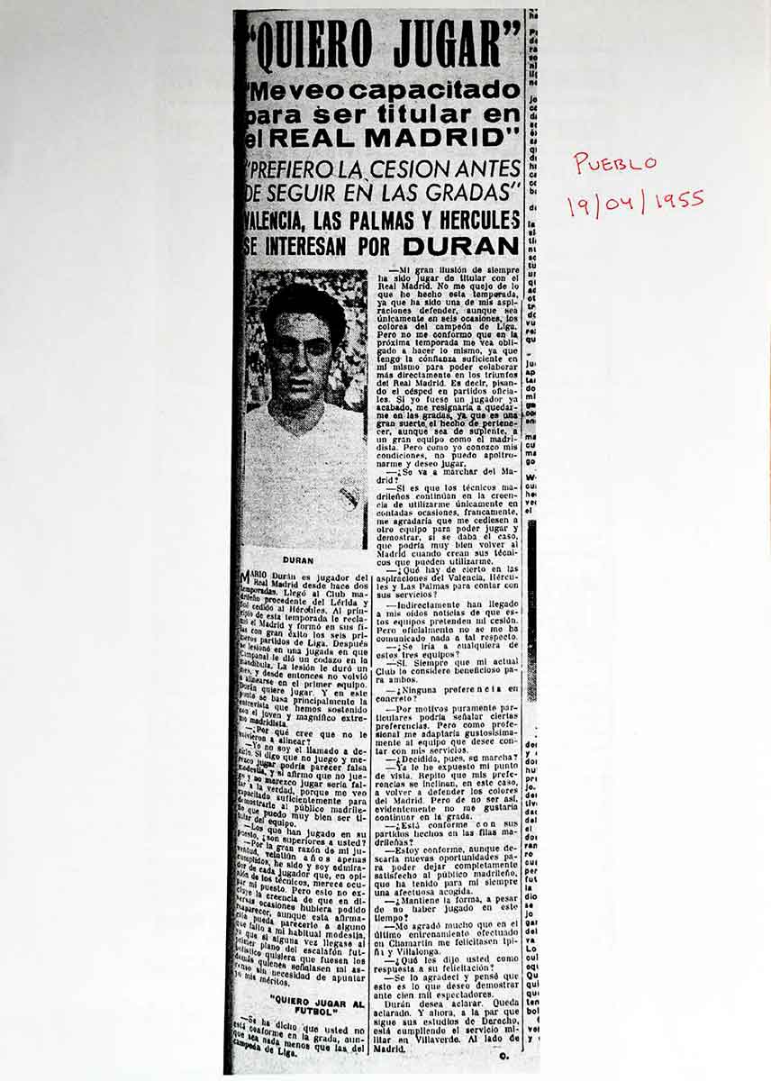 Durán aterrizó en la capital el mismo verano que Alfredo di Stéfano y Francisco Gento. En la pretemporada se le pudo ver en tres amistosos contra el Alcalá en el Municipal del Val, la UD San Lorenzo en El Escorial o el CD Tarancón en la localidad conquense. Logró dos goles, uno frente a los alcalaínos y otro con los escurialenses demostrando su efectividad de cara al marco contrario. Sin embargo, la competencia en su puesto era atroz y en la plantilla blanca se encontraban Adolfo Atienza, Joseíto, el uruguayo Britos o Juan Vázquez. Así, el club blanco decidió cederlo al Hércules que estaba en Segunda junto a otros dos compañeros: Marsal y Roth.