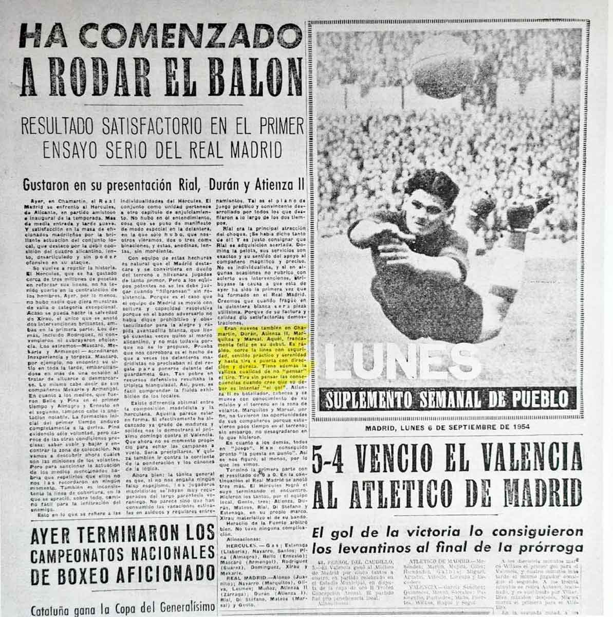 En la presentación del equipo blanco el 5 de septiembre de 1954, contra el Hércules, el extremo diestro gustó en la primera parte como describió Pueblo: “Corre la línea con seguridad, sentido práctico y serenidad y hasta tira a puerta con dirección y dureza. Tiene además la valiosa cualidad de no ‘pensar’ en el tiro. Tira sin pensar las consecuencias cuando cree que su deber es ‘intentar el gol’”. Compartió delantera con Rial, di Stéfano, Mateos y Gento y se compenetró muy bien con el interior derecho argentino recién fichado de Nacional de Montevideo. Consiguió el tercer tanto de los madridistas en la victoria por 9-1 y una semana después salió en el once del debut liguero.