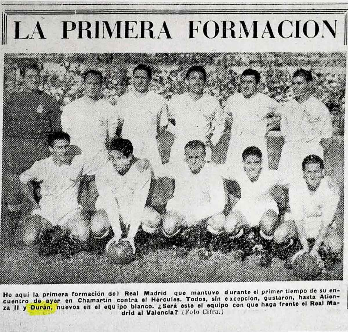 El Valencia se llevó el triunfo de Chamartín por 1-2 y para MARCA Durán “no hizo honor a su promesa del domingo pasado”. En la segunda jornada el Real Madrid venció en Atocha y en la tercera llegó el estreno goleador del catalán. El conjunto blanco pasó por encima de la UD Las Palmas y Durán anotó el 4-0 en el triunfo por 7-0. Así fue el gol según la crónica de Lorenzo Pérez Sancho en ABC: “Avanza toda la delantera blanca, falla Verde, se descoloca Juanono y Durán llega antes, tira y hace gol”. El jugador de Balaguer era ya un fijo para el entrenador uruguayo Enrique Fernández que lo siguió alineando los siguientes tres partidos. En la cuarta jornada volvió al Rico Pérez en un choque que terminó en tablas y en la quinta fecha del campeonato sumó su segunda diana contra el CD Málaga. La delantera blanca formada por Durán, Rial, Di Stéfano, Joseíto y Gento rayó a gran altura y los merengues vencieron por 4-1. El segundo gol de Durán en Primera fue tras “disparo de Muñoz desde fuera del área que rechaza el poste, lo recoge Durán y este nuevo tiro va a la red”, según escribió Gilera en Pueblo. A mediados de octubre, el balagariense no podía imaginar que disputaría su último partido en Primera y también oficial con la zamarra blanca. El Real Madrid visitaba Nervión contra un Sevilla que disponía de grandes jugadores como Campanal, Ramoní, Arza o Araujo. Los locales ganaron por la mínima y Durán cayó lesionado en un choque con el defensa Campanal. El impacto fue durísimo y le produjo al extremo derecho una fractura de mandíbula que le tuvo un tiempo de baja.