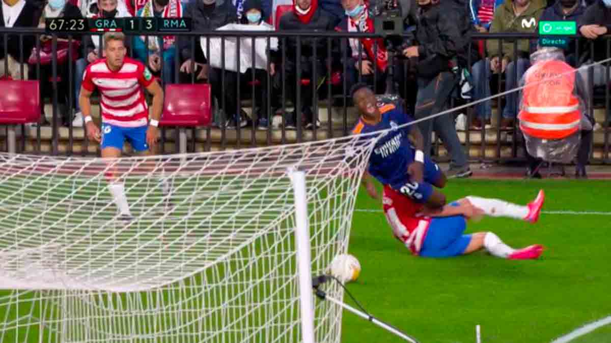Primera parte bastante tranquila, sin amonestaciones, aunque Monchu pudo verla perfectamente en el 13' por un pisotón a Kroos. En esos instantes también se levantó la bandera por un fuera de juego muy al límite de Vinícius cuando solo deben hacerlo si es muy claro y nítido. Mal ahí el línea. En el 25' llegó el segundo gol merengue con todo el Granada protestando fuera de juego de Nacho. Sin embargo, en la repetición se vio que Puertas rompía el offside con cualquier jugador blanco. Cinco minutos después, Soro salvó en la línea un balón que se colaba tras disparo de Asensio. La cámara de portería reflejó que el cuero apenas sobrepasó unos centímetros la raya. Por último, en el inicio de la acción del tanto local, Vinícius cayó al suelo en pugna con Quini, pero lo cierto es que el excanterano merengue entró con energía y fuerza sin cometer infracción.