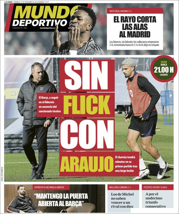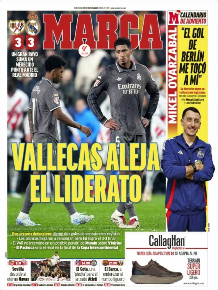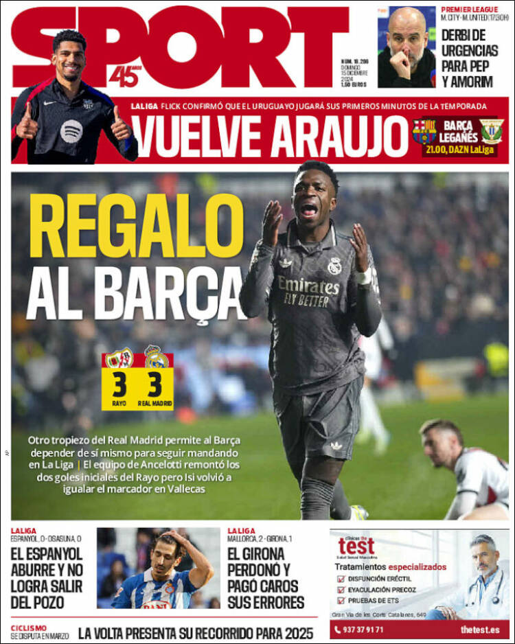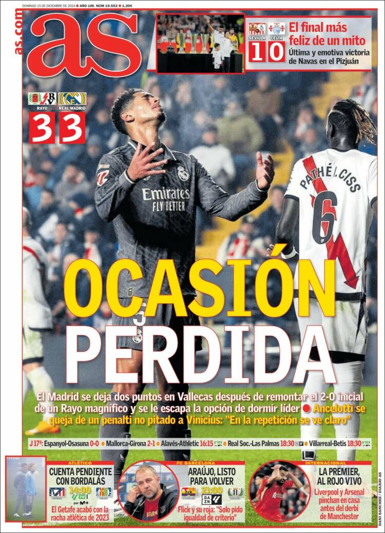 As coincide con Marca en el bajísimo perfil que le otorgan al asunto arbitral, cuando en realidad es central para explicar las cosas. “El VAR no intervino en un posible penalti sobre Vinícius”, decía asépticamente Marca. Posible my arse, como diría un viejo feligrés acodado en la barra de un pub de Leicester. “Ancelotti se queja de un penalti no pitado a Vinícius”, informa As. Bueno, por lo menos no dice “POSIBLE penalti”, como hace Marca de manera indignante, pero seguimos echando de menos la contundencia que este asunto demanda. Y además son dos penaltis, no uno. ¿Alguien puede imaginar la tabarra mediática que estaríamos recibiendo por parte del barcelonismo en el muy improbable escenario de que ELLOS hubieran sufrido este arbitraje? Estarían ardiendo Troya y ciudades dormitorio limítrofes. Si esa patada impune la hubiera sufrido Lamine Yamal, el asunto abriría telediarios, las terminales mediáticas culés de la capital se mostrarían incendiarias, y no queremos ni pensar en el tono de las portadas protoculés editadas en la Ciudad Condal, que aquí os traemos sazonadas de regocijo por el empate blanco.