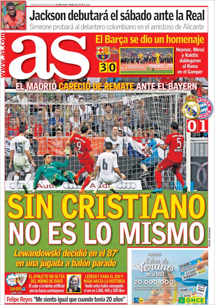 Así como la foto de portada de Marca nos parece espléndida, la de As (tomada décimas de segundo antes de la otra) nos parece manifiestamente mejorable. Es como esas tomas que pasmosamente ofrecía Tele5 cuando por razones de falta de acuerdo empresarial en materia de retransmisiones grababa sus resúmenes desde el interior de la axila de uno de los utilleros. Pero Alfredo, que no se ve ni el balón. Que solo vemos culos. Menos mal que la ramplonería de la foto se ve compensada por un titular de preclara sabiduría: "Sin Cristiano no es lo mismo".