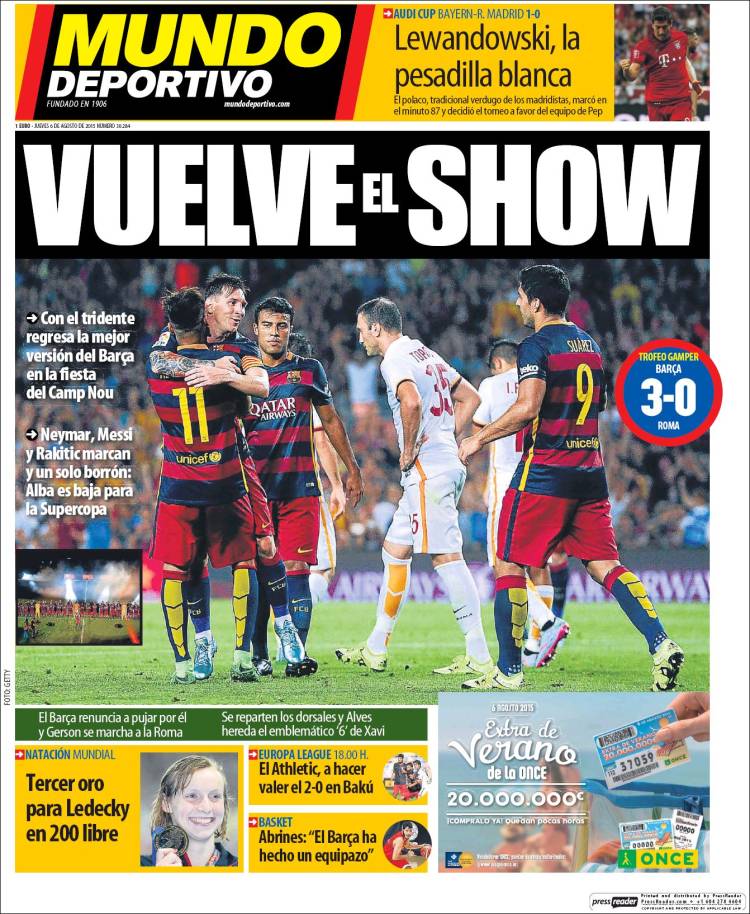 Cómo nos gustaría a veces que el SportiIvo fuese un tabloide británico y que el simple cambio de la letra final de un titular ("SUPERMESSY") pudiera dar a entender de modo fidedigno que todo es una hecatombe en las filas blaugranas. No lo es, las cosas como son, y si queréis volvemos a llamar a la nanny más mágica de Londres para hacernos pasar el trago con un poco de azúcar o un paseo por los tejados con una legión de deshollinadores. "Vuelve el show", anuncia Mundo Deportivo, demostrando, como ya insinuaba Ray Davies en aquella canción donde relataba su paseo por el mítico Hollywood Boulevard de Los Angeles, que todo el mundo está en el showbiz, aunque solo los nombres de unos pocos, junto a sus manos, quedaran inmortalizados en el asfalto de la senda de las estrellas. Qué sutil advertencia al Barça encierran, por cierto, los versos finales de la canción.
