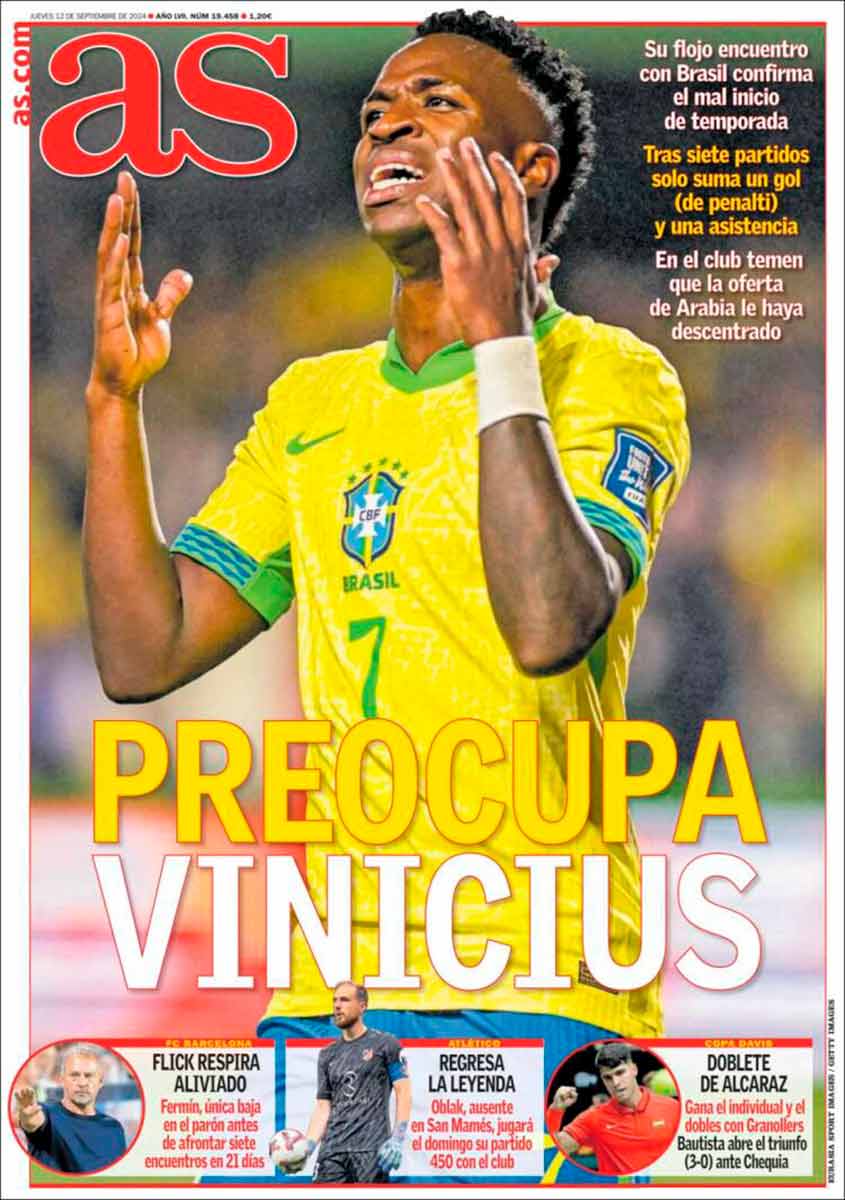 Al diario As lo que le preocupa es el rendimiento de Vinícius con la selección de Brasil. Titulan «Preocupa Vinícius», aunque realmente lo que hace Vini es molestar, concretamente a racistas, cafres, vinagres, antimadridistas y gran parte de la prensa. «Vinícius molesta» habría sido un título más acertado. Aunque sinceramente ese titular casa más con la filosofía focal (no confundir con fecal) de Marca.