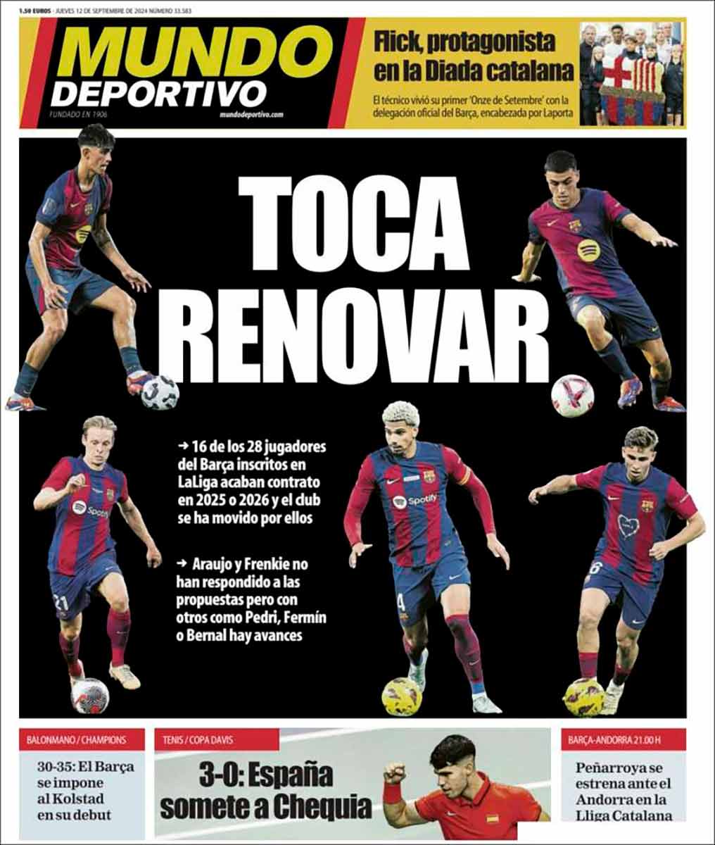 Mundo Deportivo centra su atención es la necesaria renovación de buena parte de la plantilla culé. Ya sabemos lo creativo de los contratos firmados tanto por la directiva de Bartomeu como por la de Laporta, con soluciones tan lógicas como pagar cada año mucho más dinero a futbolistas veteranos, los cuales alcanzarán su máximo sueldo cuando lleguen a la edad de Jordi Hurtado.