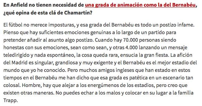 El otrora futbolista de Osasuna se afana en desacreditar a los bravos hinchas blancos que han revolucionado la historia de un Bernabéu que durante décadas fue rehén de los ultras y preso del ópera-pipa del madridista señorial.