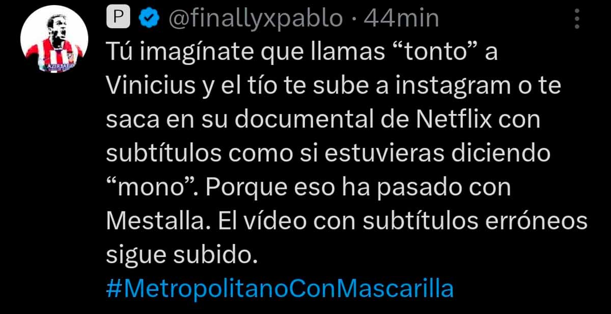 Anteayer tuvimos conocimiento de que algunos aficionados del Atlético de Madrid se concertaban en redes sociales para acudir a su estadio portando mascarillas para insultar racialmente a Vinicius Jr sin ser identificados (cobardes, además de racistas).