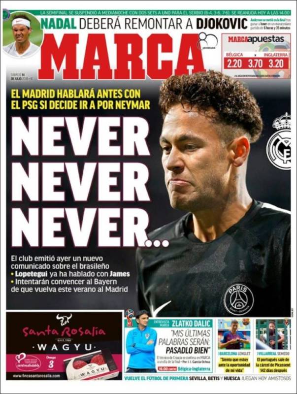 Qué pasará, qué misterio habrá, puede ser mi gran summeriana. O no. Qué sabemos. Lo que sí va quedando claro desde los anales (con perdón) de la historia del periodismo deportivo es que las portadas veraniegas se repiten más que esos gazpachos con exceso de ajo y pepino. Neymar es el hombre del verano, la ensalada de la casa, la sopa boba. Tanto es así, que el Madrid ha vuelto a publicar un comunicado oficial desmintiendo y tal y cual, cosa que no quita que más tarde, con la posible variación de alguna de las condiciones actuales, el cual se convierta en el tal y entonces el comunicado ya pueda ser de otro tipo. Últimamente la política de fichajes de un gran club es precisamente eso, política, con todo lo que ello implica de juego de tronos, de táctica y estrategia, de mano izquierda, requiebro y tino, de control de tiempos y tempos, de maduraciones y cálculos. Es algo así como un indefinido mientras que nos tiene a unos en vilo, a otros bostezando, y a nosotros en el difuso término medio entre ambos estados.