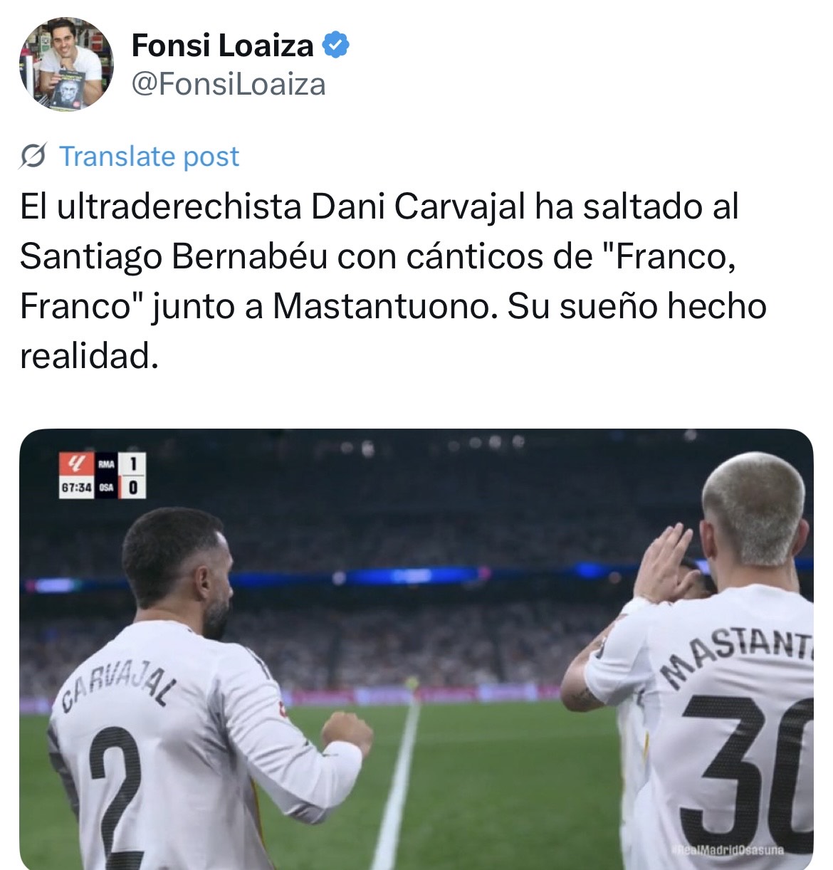 Como también destaca la primera plana prisaica, tuvo lugar el esperado debut de Franco Mastantuono, quien dejó grandes detalles y se desfondó sobre el césped. El jugador fue recibido por el Bernabéu al grito de “Franco, Franco, Franco”. Es su nombre de pila, sí, pero reconocemos que las concomitancias políticas pseudosimpáticas que para muchos acarrea el cántico hace tiempo que dejaron de hacernos gracia, suponiendo que alguna vez lo hicieran. El Madrid es, desde su mismísima fundación, un club que ha huido de la política como de la peste, y el uso (aunque sea bromista) de este cántico abona el terreno para conclusiones sociológicas profundamente erradas. Ved si no cómo la anécdota puede llegar a favorecer delirios calumniosos como el del siguiente freak.