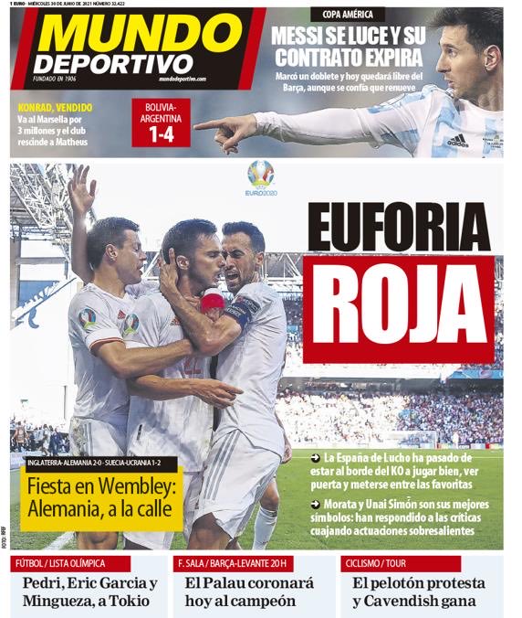 Sportivo oscila entre dar preponderancia a la Roja y hablar del fin oficial del contrato de Messi como eje central de sus portadas. Lo de Messi puede ser un drama porque queda en efecto libre, como el sol cuando amanece, como el ave que escapó de su prisión y puede al fin volar. O sea, como Matheus Fernandes pero de manera legal y con todo el ruido que la noticia merece. La noticia de Matheus merece más eco todavía pero nadie se lo va a dar, amigos míos, porque esta gente hace lo que quiere de continuo sin que sus barrabasadas apunten alto en el panorama mediático español. Pero en fin, qué cabe esperar. Hablamos de la clase periodística que en 30 años no fue capaz de dedicar un solo esfuerzo de investigación a las corruptelas que acabaron con Villar imputado en el calabozo, pero muy capaz en cambio de asignar un reportero-guardaespaldas a Bale para calibrar la hora exacta a la que salía del Bernabéu en los partidos a los que no iba convocado.