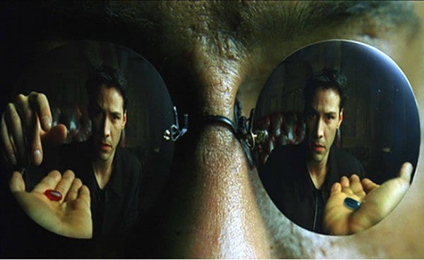 Con toda probabilidad la idea según la cual los seres humanos, o un grupo significativo de ellos, vivimos sumidos en una especie de sueño generado por entidades que controlan nuestro destino no era cien por cien original cuando los hermanos Wachowski decidieron llevar su versión de la historia a la pantalla grande en 1999, obteniendo un gran éxito, sobre todo en la magistral primera parte, y no así en las otras dos, en mi opinión demasiado recargadas, confusas y cuyo mensaje y puesta en escena nos conducía sin remisión al paroxismo absoluto. Pero volviendo a la primera, en ella un personaje denominado Morpheus hacía elegir al protagonista Neo entre dos pastillas: la azul le permitía volver a su mundo de ensueño, irreal aunque ciertamente placentero, mientras que la roja le mostraba el universo descarnado, terrible, apocalíptico, pero real al fin y al cabo. Neo prefirió conocer la verdad y no seguir viviendo en Matrix, sino combatirla desde dentro como una especie de elegido mesiánico.