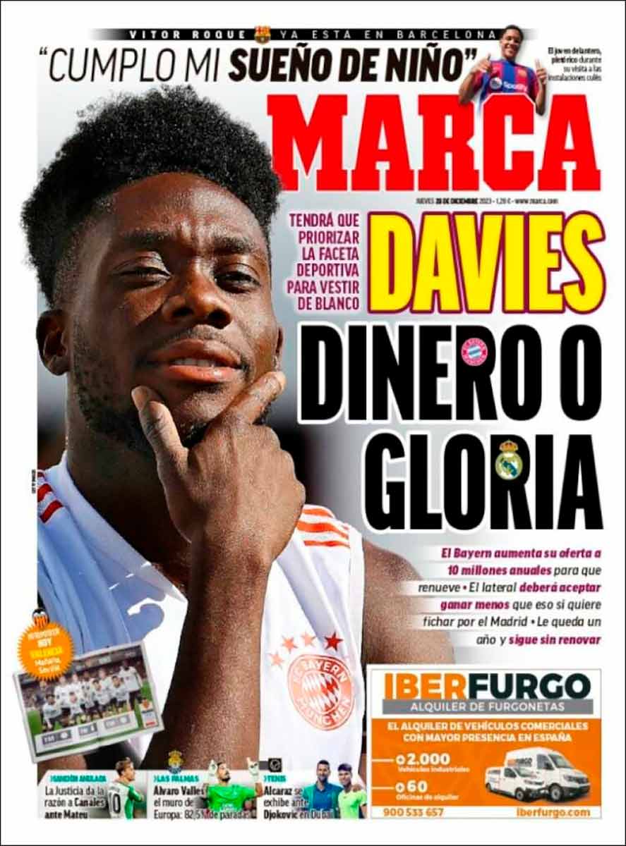 Los de Gallardo dedican su primera plana a Davies, «Dinero o gloria», titulan. El dinero es el Bayern y la gloria el Madrid. Se encargan de enfatizarlo añadiendo escuditos a las erres de las palabras. Que el club blanco no pueda, o más bien no quiera, pagar un salario desorbitado por el lateral no significa que pague poco, ni que pague en churros, ni que haga lo que demonios haga el Barça con sus jugadores para abonar sus salarios.
