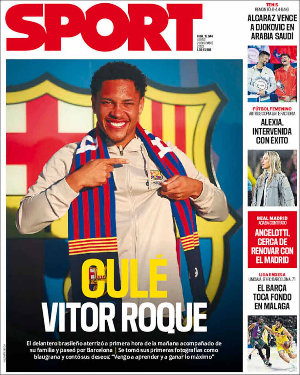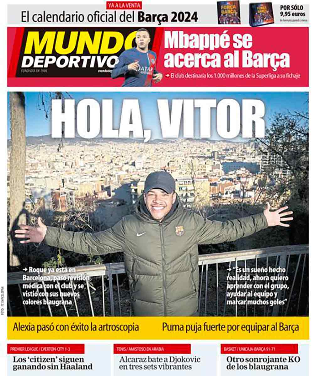 Vitor Roque posa con el anorak del Barça para la portada de Mundo Deportivo y lo hace marcándose un Bellingham en toda regla. Glorioso. En el portanálisis de ayer nos preguntábamos: ¿a quién entusiasma Vitor Roque? Y resulta irónico que quien está entusiasmado es el propio Roque, pero con el inglés del Real Madrid (al igual que lo estamos nosotros con esa coma del vocativo —«Hola, Vitor»— tan bien puesta en el titular).