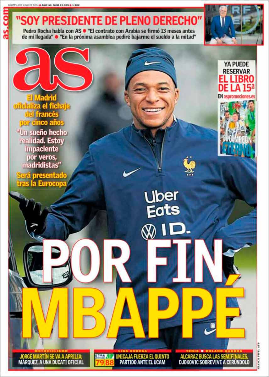 La portada de As también la semimonopoliza Kylian: «Por fin Mbappé», reservan la azotea para blanquear a Pedro Rocha. Es de bien nacidos ser agradecidos.
