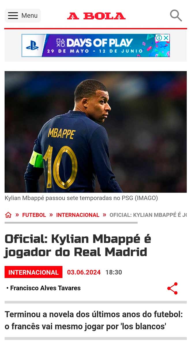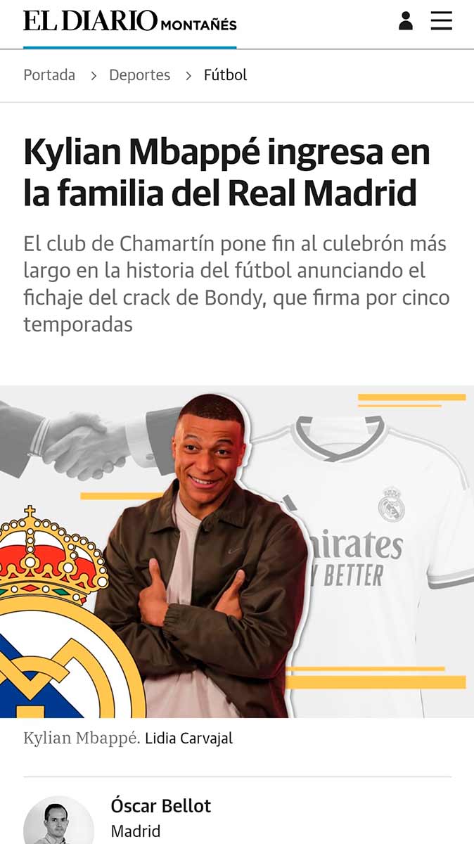 Para finalizar, como es habitual, el Diario Montañés, que visto desde España no es internacional, pero sí cántabro, como la Galerna del Cantábrico. Esperemos que Kylian emule a don Paco y coleccione Copas de Europa en el Madrid como si no hubiera mañana.