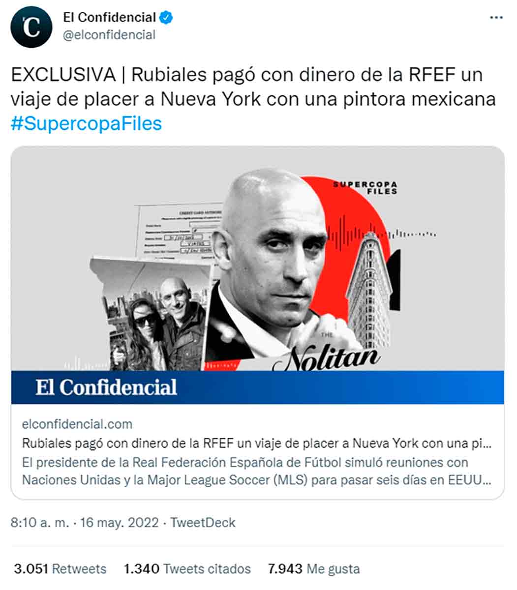 11. «El Confidencial afirma que Rubiales pagó con dinero de la RFEF un viaje de placer —tal vez para darle uso a la brocha— a Nueva York con una pintora mexicana»