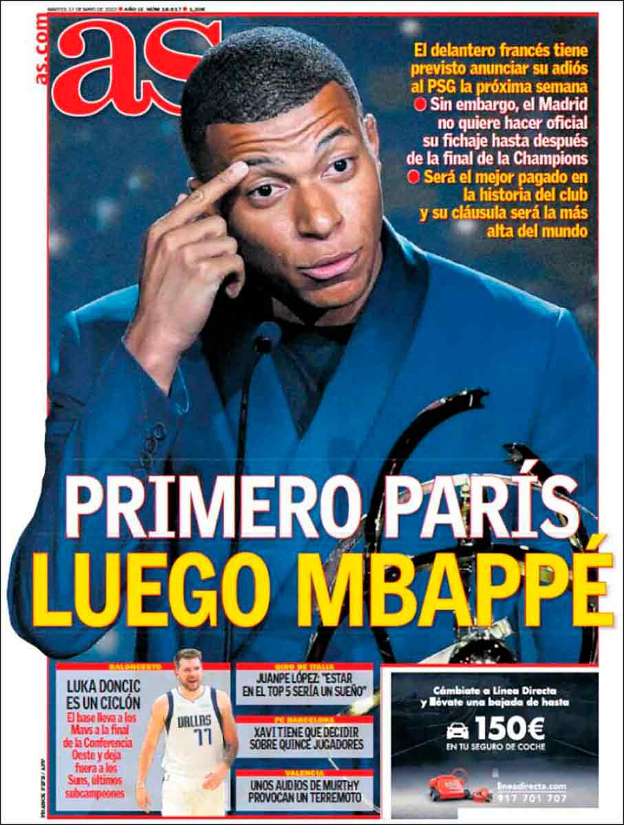 As se centra más en los tiempos del fichaje. Asegura que el delantero francés anunciará que no renueva con el PSG la próxima semana y que el Madrid tiene previsto anunciar su contratación después de la final de la Champions del día 28 frente al Liverpool.