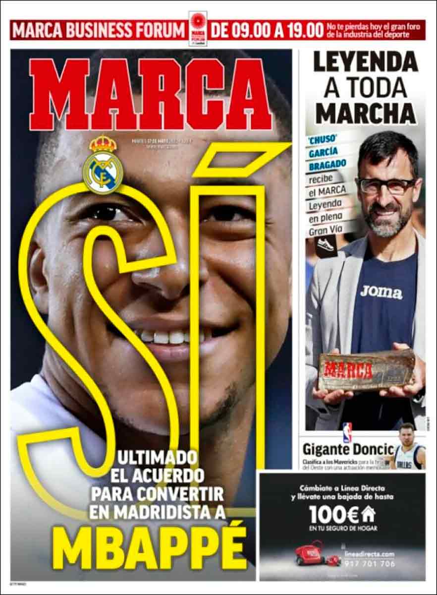 Marca superpone un SÍ y un escudo del Real Madrid a la cara sonriente de Mbappé y afirma, como ya hemos comentado, que está ultimado el acuerdo para convertir en madridista a Mbappé. Nosotros especificaríamos que ya es madridista, lo que hará el contrato será convertir a Mbappé en jugador del Real Madrid Club de Fútbol.