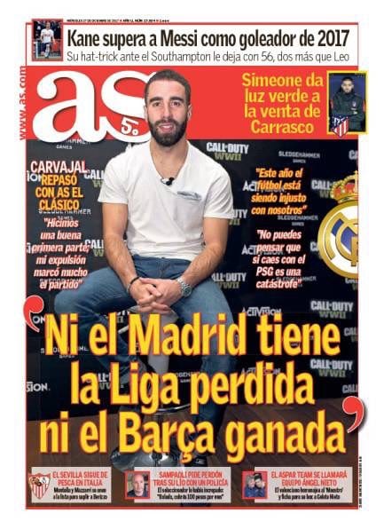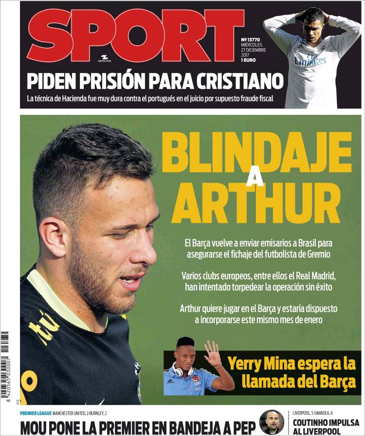sEn 'AS' y 'Sport' bajan las aguas más calmadas. Carvajal intenta endulzar este terrible fin de año asegurando que la Liga sigue viva -ojalá, Dani, ojalá- y en Barcelona esperan que los fichajes acaben llegando en enero. Tiene pinta de que les puede pasar lo mismo que en verano, cuando sonaron Coutinho, Di María y Griezmann para acabar apostando por un 'Plan B' o 'C' que, siendo sinceros, no les ha salido del todo mal. Sea como fuere, volvieron al 'Plan A' durante semanas para intentar ahora convencer a los culés de que los nombres son Arthur y Yerry Mina. Veremos.