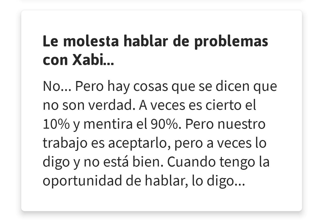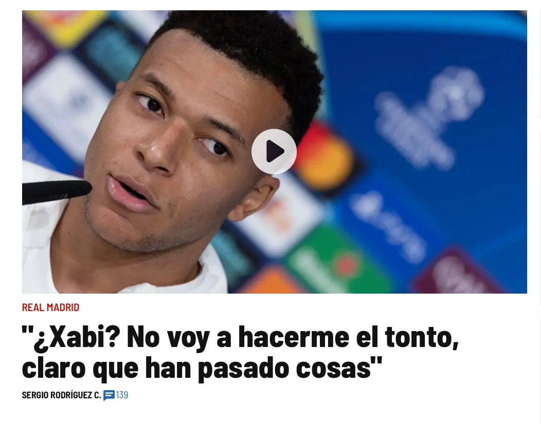 Realmente, a Mbappé le comentaron que parecía que no le gustaba cuando le preguntaban si hubo problemas con Xabi con parte de la plantilla. Kylian, tras una breve introducción, aclaró que en el Madrid sucede lo mismo que en cualquier gran club y que: «Hay muchas cosas que se dicen que no son verdad, ¿sabes? Hay cosas que a veces son verdad, hay cosas que son falsas, cosas que la gente dice 10% e inventa 90%. Y yo pienso que eso no está bien, pero nuestro trabajo es no decir nada y aceptar, pero cuando tengo la oportunidad de decirlo lo digo».
