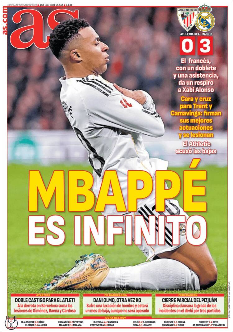 Marca habla de un SuperMbappé (nada que objetar) y de un Madrid que fue “por fin un buen Madrid”. Está tirado con mala leche, por cuanto induce a pensar que es la primera vez que juega bien, cuando lo cierto es que el Madrid ya lo ha hecho (entre bien y muy bien) algunos partidos este año. Lo exasperante han sido las subidas y bajadas, las inconsistencias, la montaña rusa, el rompepiernas. De hecho, y en virtud de este pasado reciente, lo más sensato tras esta gran victoria será tener los pies en el suelo y no descartar un pronto nuevo tropiezo, por ejemplo ante el Celta. No es ser aguafiestas, es ser realistas. La línea errática de este año aconseja prudencia y pies en el suelo, la receta opuesta a la euforia.