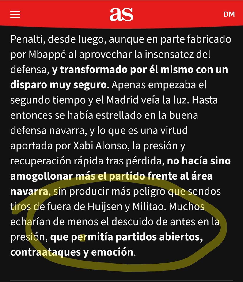 La verdad es que le han echado imaginación para retorcer la cosa: la presión tras pérdida del Madrid lo único que hacía era amogollonar (sic) el partido frente al área osasunista; sin embargo, antes, el hecho —criticado hasta la saciedad durante años— de que no se presionase permitía partidos abiertos, contraataques y emoción. Sería más honesto escribir: todo lo que haga el Madrid está mal, sea lo que sea.