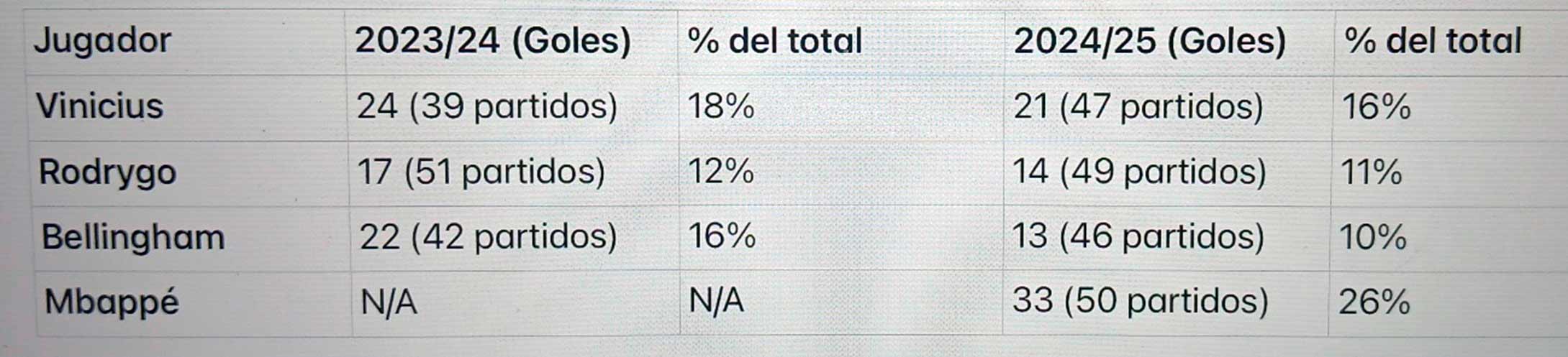 La conclusión que podemos extraer es que la producción de Vinícius, Bellingham y Rodrygo ha bajado, mientras que Mbappé ha irrumpido con fuerza. Esto refleja un cambio en el reparto de protagonismo goleador: