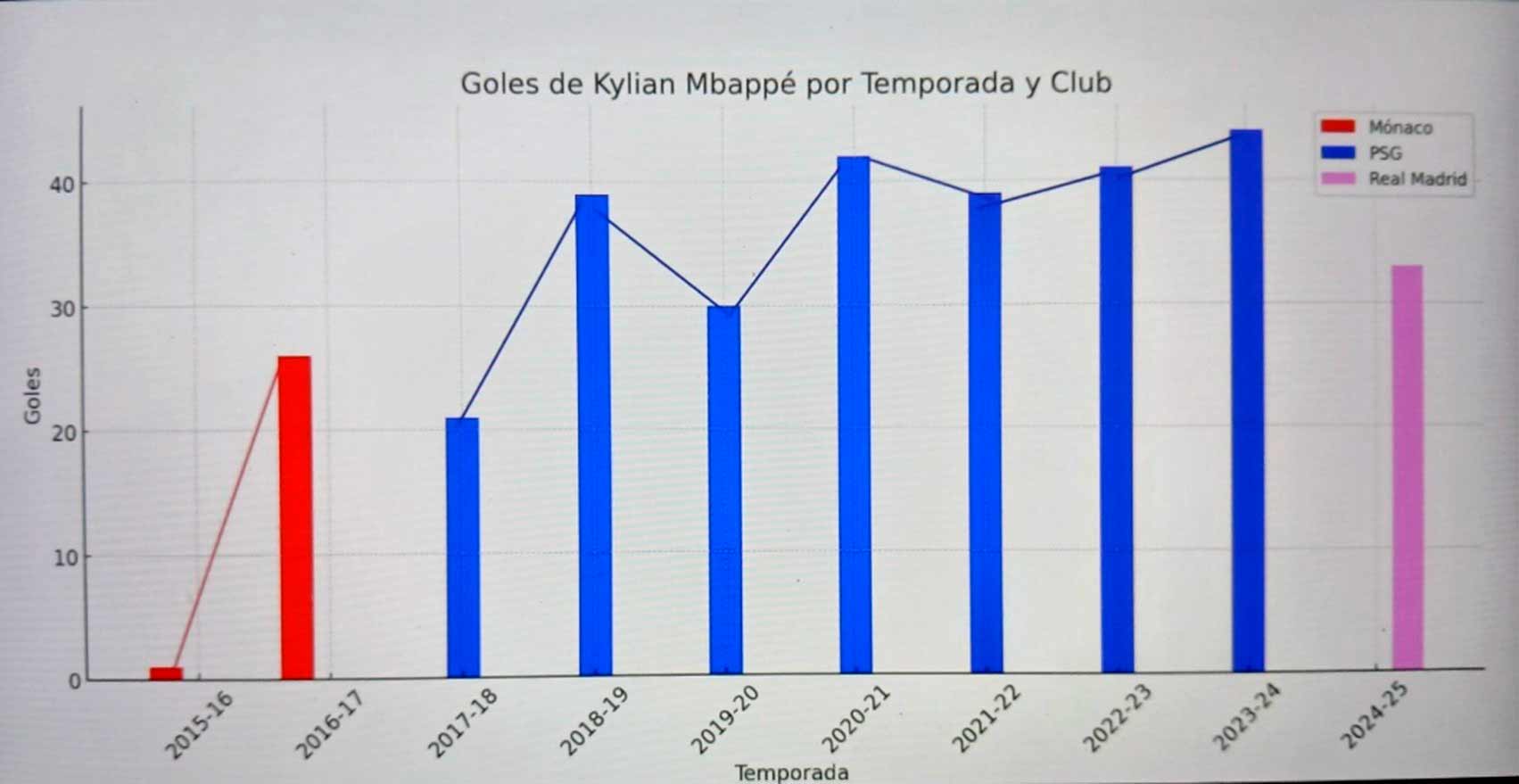 A continuación, ofrecemos una serie de datos obtenidos de la web Transfermarkt para analizar el cambio de tendencia anotadora entre la temporada pasada y la presente al objeto de evaluar la inclusión de Kylian Mbappé en el equipo.