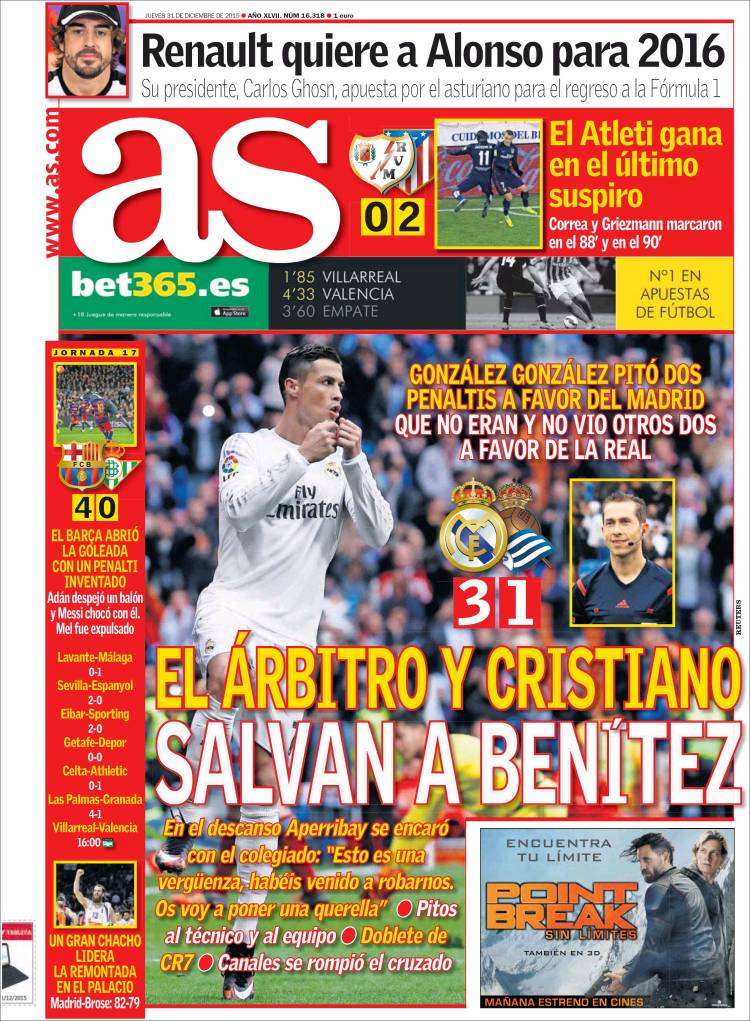 Es cierto que en la tarde del Bernabéu se señalaron dos dudosas penas máximas a favor del Real Madrid. En la primera, Benzema exageró una carga del defensor txuri-urdin. En la segunda, un centro de Bale rebotó en la mano de otro defensa donostiarra. Aunque en ningún caso se desplomó nadie fulminado por un rayo divino, la Central Lechera ya disponía de suficiente munición para recontrarequeteametrallar a arcabuzazo limpio nuestro todavía dolorido corazón blanco. Hernia y Ouija se dan la mano –aunque no precisamente como buen y fiel hermano- para atribuir al árbitro la sufrida victoria madridista de ayer. Aunque el orden de factores no altera el producto, Marca sitúa por delante a Cristiano como artífice de la victoria, mientras que –cómo no- As concede toda la preponderancia a González González, que resulta que así se llama el colegiado.