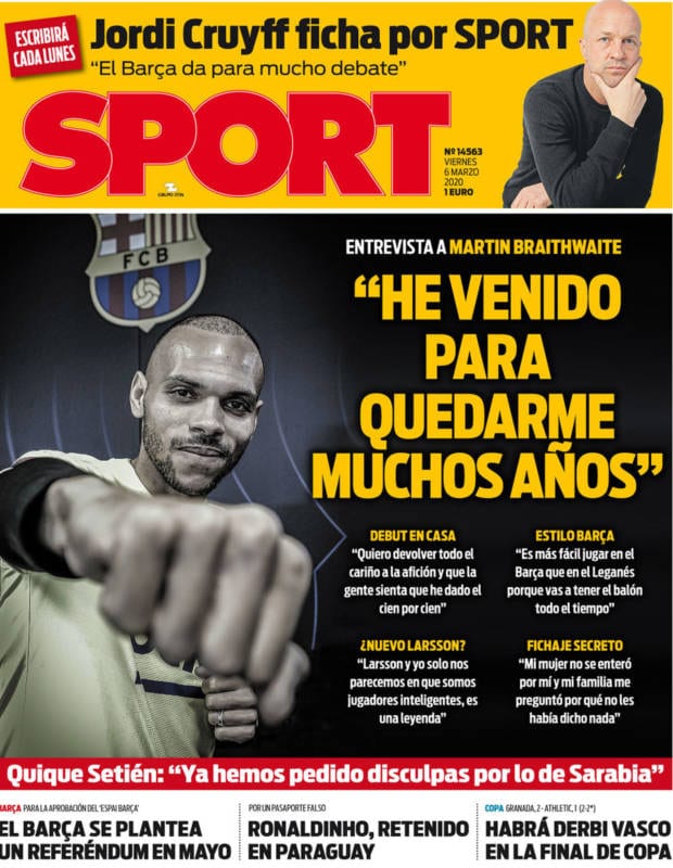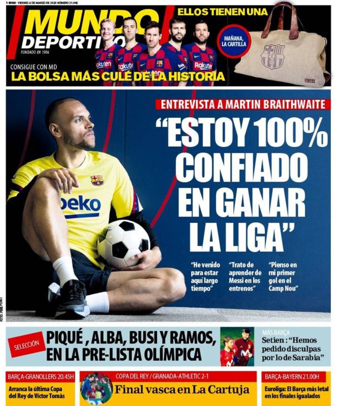 Las portadas. Enhorabuena al Athletic de Bilbao por haberse plantado en la Final de Copa, que será una Final Vasca. Entrevista a Braithwaite, que no parece muy afectado por la suerte del club del que se fue en medio de la temporada, en la ventana Dembélé, dejando maniatado y sin su goleador a un equipo modesto como el Leganés, que flirtea con el descenso.