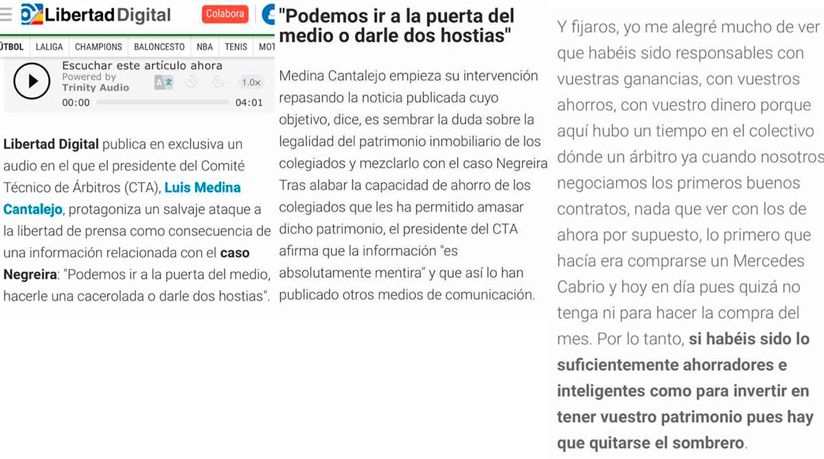 La verdadera noticia del día de ayer, y que como tal no aparece en las portadas, es la vergonzosa alocución ante cientos de árbitros, en reunión online, por parte del máximo mandatario del CTA. Libertad Digital tuvo acceso a la grabación y hoy se la ofrece a sus lectores. Hiela la sangre en las venas.