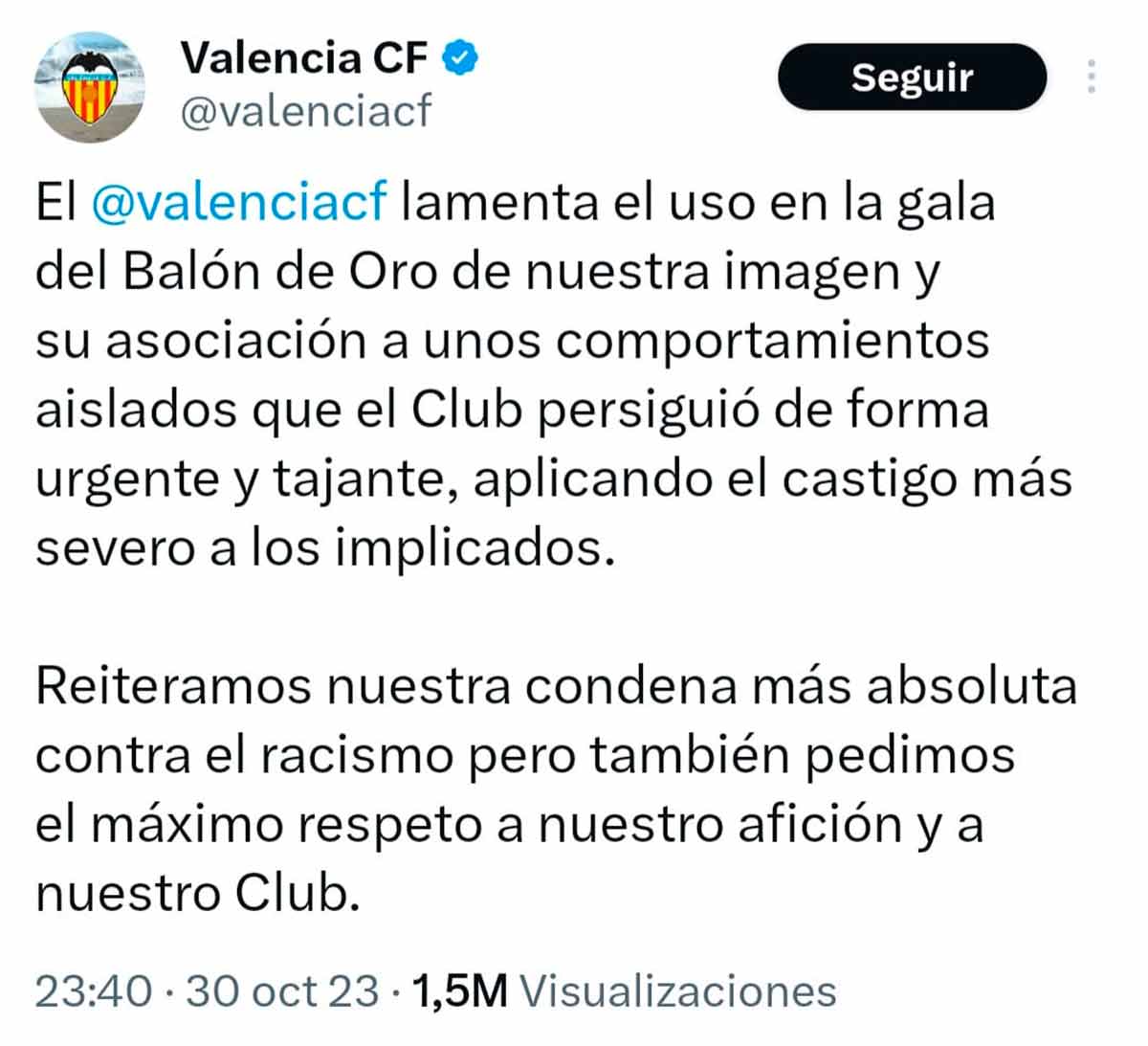 El Valencia, queridos amigos, es ese club de fútbol que no pone coto a los desmanes racistas y violentos de parte de su afición, que encima se permite regañar a la víctima de los mismos que es Vinícius, y que encima de encima —suponiendo que exista esa expresión— exige que nadie se lo afee. Pues mirad por dónde, amigos chés: os lo han afeado en el mayor evento del mundo del fútbol, el que el planeta entero ve. A veces, hacer las cosas bien no es sólo lo correcto sino que además renta. O al menos cabe afirmar que no hacerlo bien produce réditos negativos.