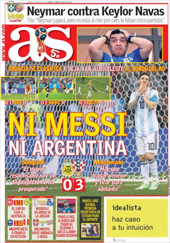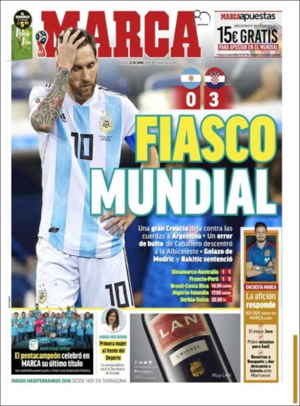 Llama la atención en estas dos primeras planas el énfasis otorgado a la delicadísima situación del combinado sudamericano y su pésimo juego. Comprensible, pero ¿dónde queda la correspondiente loa a la gran actuación de Croacia y de Luka Modric? No es ya que Messi lleve años perdiendo por goleada su pulso universal contra Cristiano, sino que ayer hizo lo propio, cara a cara, contra el mejor escudero del portugués. Al mejor caballero de la historia y el porvenir de todos los caballeros medievales le derrota con el sable el Capitán Trueno, pero también Crispín. Sigrid de Thule espera tras la esquina para hacerle un pulso gitano.