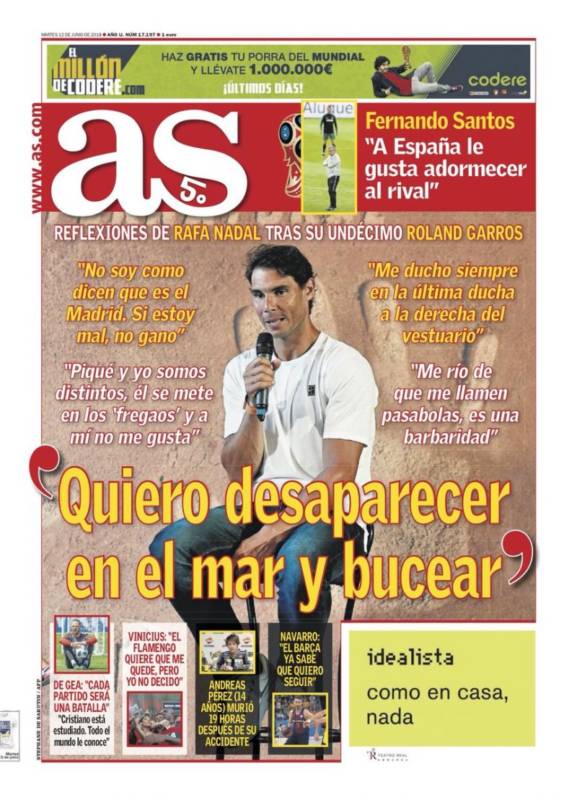 Pero Nadal dejó más, mucho más. El campeón de Roland Garros decidió soltarse y habló un poco de todo. Entre otras cosas, se defendió cuando quisieron compararlo con Piqué por aquello de pedir elecciones generales en España. "La situación de Piqué es diferente a la mía, sin entrar en un debate. Gerard está siempre muy implicado y le gusta estar en los 'fregaos'. A mí no. El otro día no di mi opinión como Rafa Nadal tenista, sino como un ciudadano español normal. Di una simple opinión. Ni reclamé, ni exigí ni pedí nada", explicó.