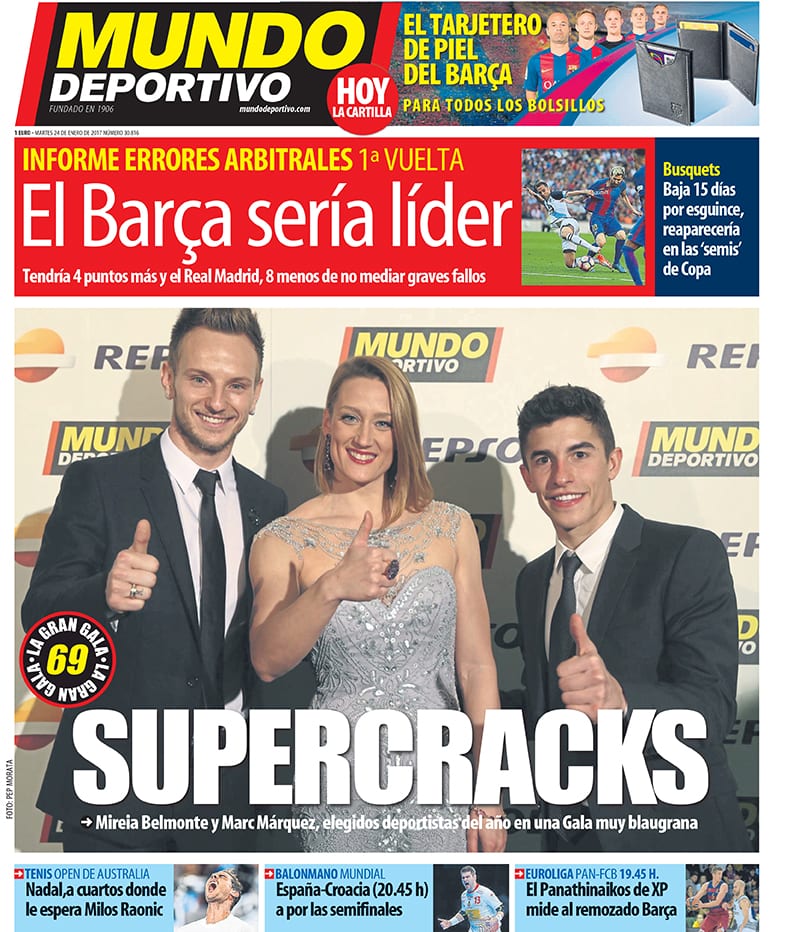 Según estas cuentas, el líder debería ser el Barça con 45 puntos, mientras que el campeón de Europa pasaría a tener 35. No habría Liga directamente. Diez puntos de distancia al final de la primera vuelta. Pues sí que lo han hecho mal los árbitros. Y mira que Undiano Mallenco y Clos Gómez, entre otros, lo han intentado disimular. Si hasta en el Clásico maquillaron la realidad para que no se notase el descaro con el que están llevando al Real Madrid hacia el título. Pero ha dado igual. En 'Mundo Deportivo' han descubierto el pastel. Los de Zidane deberían estar luchando por entrar en Europa League, no por ganar el título. Puta flor. Putos arbitrajes. De hecho, ponen el tarjetero de piel del Barça encima de la noticia del atraco para ver si algún madridista 'pica' y lo roba.