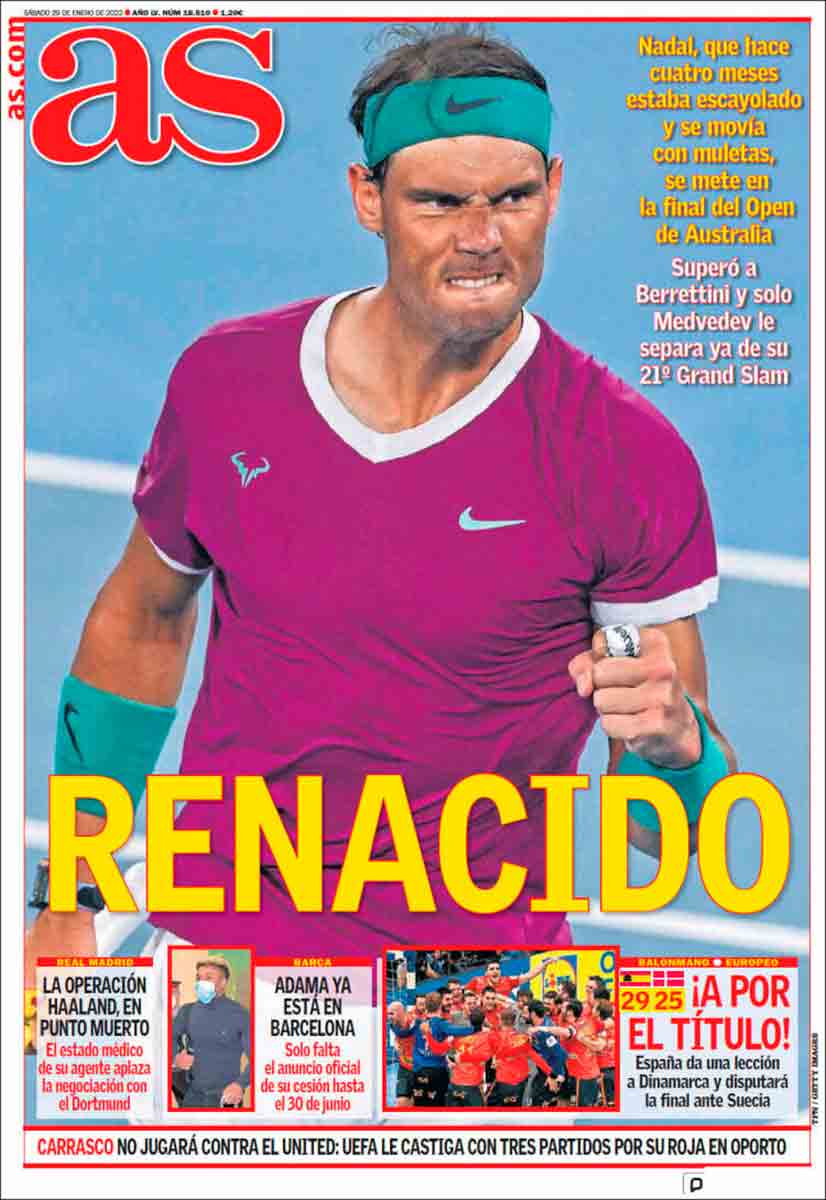 Nadal ha vuelto. Nunca se ha ido en toda su carrera, y cuando lo ha hecho ha sido para recuperarse de sus lesiones y volver a competir por llegar a lo más alto. Para mejorar sus golpes, para progresar en su juego, con un espíritu de superación y sacrificio que es puro madridismo. Ayer, a sus 35 años, derrotó al italiano Matteo Berrettini (25) en las semifinales del Open de Australia y mañana disputará la final contra ese ruso malencarado que es Daniil Medvédev (25). Ayer vimos al ruso insultar al juez de pista y al equipo técnico de su rival Tsitsipas con una verborrea que solo habíamos contemplado en cierto delantero uruguayo que habita la Liga española.