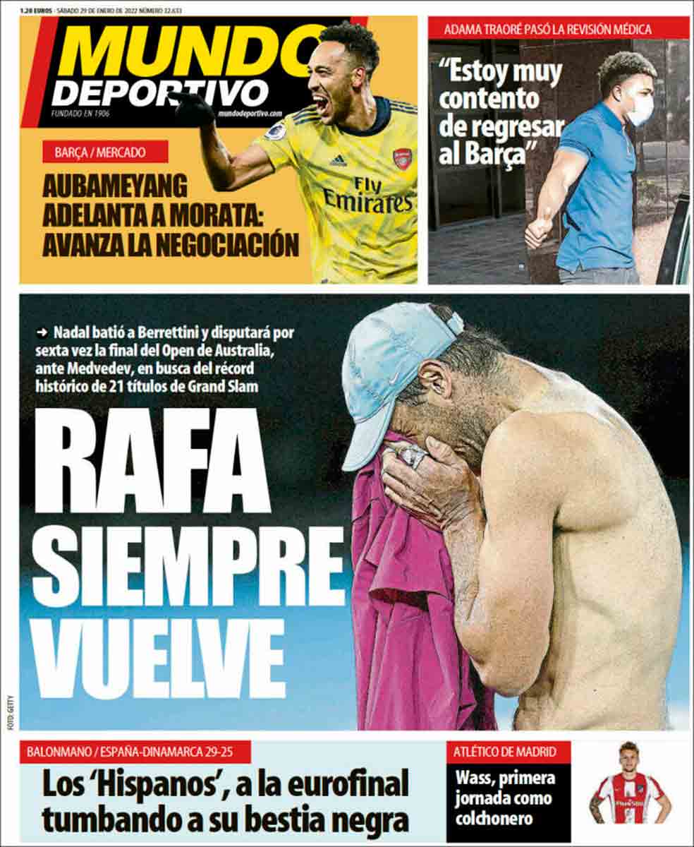 La prensa cataculé menciona a Nadal, pero sigue a lo suyo en el vano intento de despertar la ilusión en la parroquia con la llegada de Adama Traoré y el plan B para la delantera: Aubameyang en lugar de Morata. Recuerden que el plan A era Morata o Lautaro o Neymar o Haaland o Dani Olmo o incluso Cristiano Ronaldo, o Depay, que es el que llegó para acompañar a Braithwaite Nazario, y el B es Aubameyang.