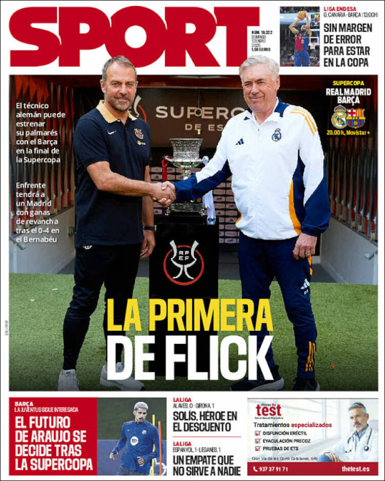 “La primera de Flick”, suelta Sport. No tan rápido, amiguitos. A ver si, en lugar de eso, va a ser el nosecuantísimo entorchado de Ancelotti, técnico más condecorado de la historia del mejor club del planeta que ayer se avino a estrechar la mano del alemán porque en la vida hay que tratar con naturalidad a gente con más limitado CV. Es verdad que en el partido de liga Flick nos mojó la oreja, pero ambos equipos llegan a este nuevo no-clásico en muy diferentes estados de forma que entonces, con Mbappé mucho más metido en la dinámica y los automatismos del equipo y mucho mejor preparación física.