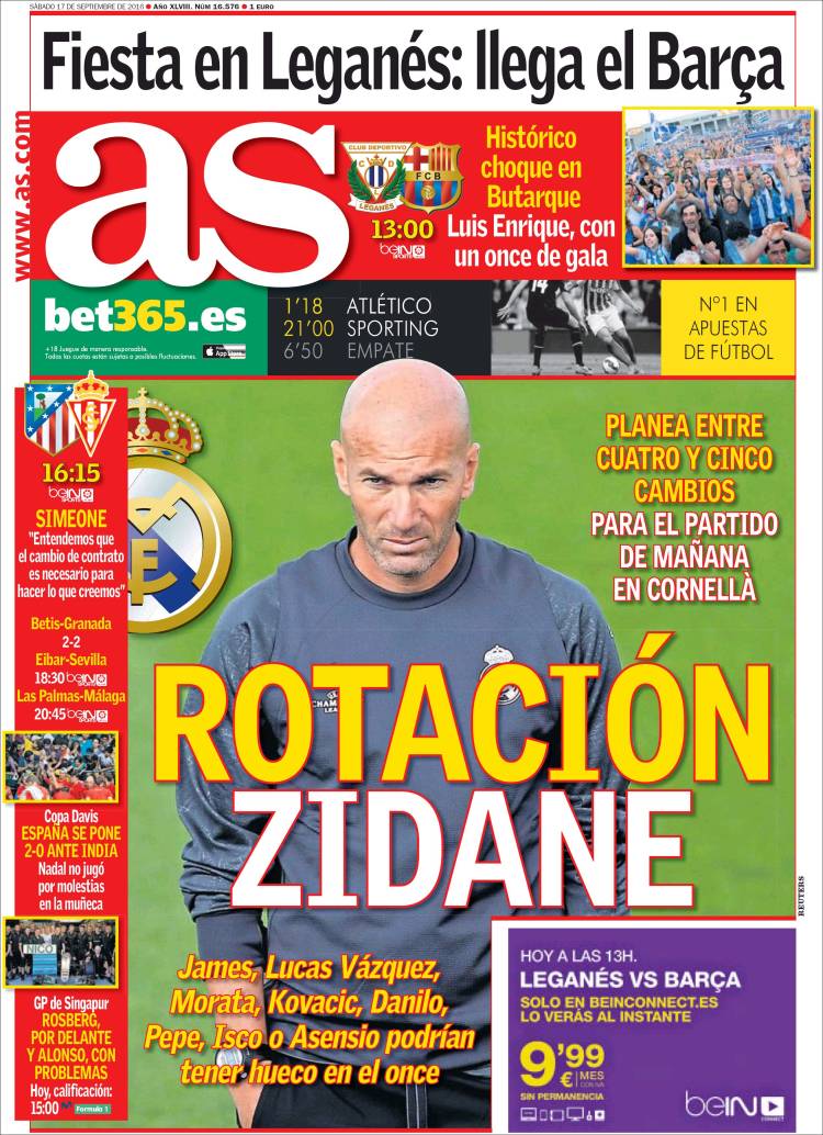 Desde aquí, por tanto, aprovechamos la portada de As para aplaudir las rotaciones de Zidane, que en realidad no entendemos como descanso para las estrellas, ni como oportunidades para los meritorios, la segunda línea o los no habituales, sino como ampliación de las opciones de victoria para el Madrid, y más con un calendario cada vez más cargado de partidos (shake your money maker). Así que más allá del posible récord que Marca no logra situar bien en nuestro horizonte, más allá del aperitivo del tridente azulgrana, hoy nos quedamos con la virtud de que en el Madrid de Zidane no haya suplentes. Qué mejor plato principal.