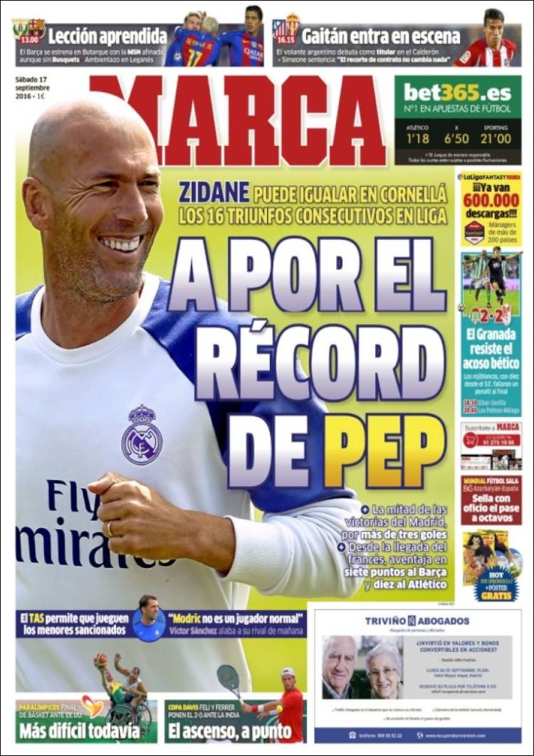 Es una lástima que cuando Sport alcanza tal nivel de conocimiento venga Marca a perderlo. Y no es que desdeñemos el mérito de conseguir el récord de victorias consecutivas en Liga -cosa menor, pero muy positiva-, sino que ya nos dirán ustedes qué nos importa si el citado récord lo ostenta actualmente Pep Guardiola, Paco Jémez o Javier Clemente. El Madrid no mira quién tiene qué; simplemente va a por ello con la convicción de que es conseguible. El Madrid mira hacia adelante, se proyecta, ve horizontes, los alcanza y continúa. Sin prisa, pero sin pausa, con el morral cada vez más lleno a cuestas. Sin revanchismos tan usuales por otros lares. Es casi naturaleza este no parar de ir, una inercia, un ADN, un modus vivendi, un querer que es un poder.