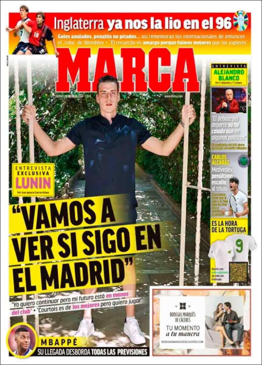 El ucraniano dice que no sabe si seguirá en el Madrid, que está en manos del club. Cada uno sabrá qué declaraciones son las más adecuadas para su futuro y es lógico que Marca destaque las más llamativas. Si uno lee la entrevista entera, Lunin muestra una cara muy sensata y normal, lo que no deja de ser un poco extraterrestre para un futbolista.
