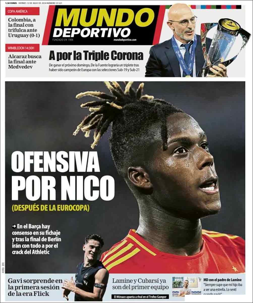 Mundo Deportivo nos toma por tontos. A nosotros y a los extraterrestres de Ganímedes. Titulan: “Ofensiva por Nico (después de la Eurocopa)”. Lo mismo hasta ellos se han dado cuenta de lo mal que lo estaban haciendo y ahora con ese “después de la Eurocopa” pretenden enmendar el pasado y dar una pátina de buen comportamiento al presente y al futuro. Como si fuese posible cambiar lo que ya han hecho. La ofensiva ya comenzó y el propio Laporta fue el ariete junto con la prensa. No insultéis a la inteligencia (aún más), Mundo Deportivo.
