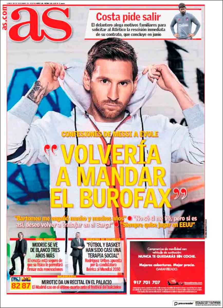 En As hay algo más de realismo a la hora de glosar la hagiográfica entrevista de Évole. Opta el diario madrileño (que no madridista) por resaltar lo del burofax y cómo el rosarino no dudaría en volver a mandarlo, pero sigue escamoteando al lector —al menos al lector de la portada— algunos de los pasajes más tenebrosos del diálogo, como las referencias trémulas del astro a la catastrófica situación financiera del Barça.
