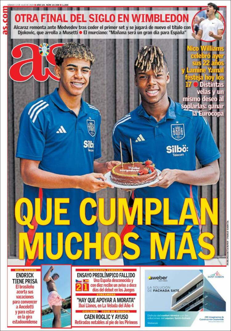 “Que cumplan muchos más”, reza el titular principal de la portada bajo la foto de ambos jugadores. Pues claro que sí, y que todos lo disfrutemos. A ser posible, Nico en el equipo en el que es feliz, y Lamine en un equipo grande, como merece, tal como escribió Jesús Bengoechea recientemente. Lamine cumple hoy 17 años y Nico Williams alcanzó ayer los 22, una precocidad que puede asustar a otros, pero nunca al madridismo. En la portada se cuela Endrick, la nueva perla brasileña madridista, quien cumplirá 18 en apenas unos días y ya ha sido decisivo para la conquista de la liga brasileña para el Palmeiras. Casualmente, también cumplía ayer el mejor futbolista de la temporada, Vinícius Jr., 24 en su caso, y ya ha marcado en dos finales de Champions. Y por si esta artillería no fuera suficiente, apenas hemos visto los primeros zarpazos de Arda Güler, 19 añitos.